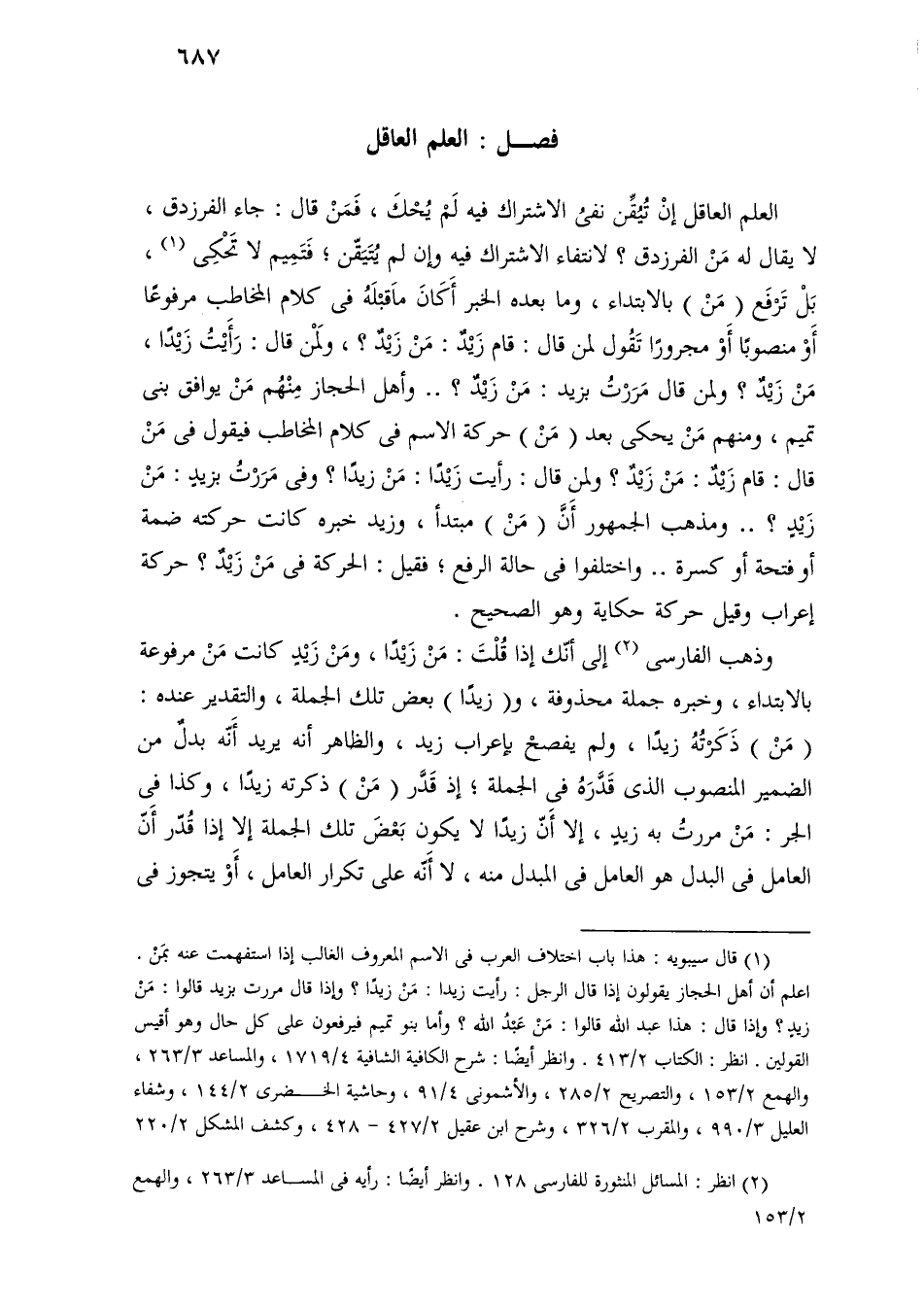 العلم العاقل إن تيقن نفي الاشتراك فيه لم يحك، فمن قال: جاء الفرزدق، لا يقال له من الفرزدق؟ لانتفاء الاشتراك فيه وإن لم يتيقن؛ فتميم لا تحكى، بل ترفع (من) بالابتداء، وما بعده الخبر أكان ما قبله في كلام المخاطب مرفوعًا أو منصوبًا أو مجرورًا تقول لمن قال: قام زيد: من زيد؟، ولمن قال: رأيت زيدًا، من زيد؟ ولمن قال مررت بزيد: من زيد؟ ... وأهل الحجاز منهم من يوافق بني تميم، ومنهم من يحكى بعد (من) حركة الاسم في كلام المخاطب فيقول في من قال: قام زيد: من زيد؟ ولمن قال: رأيت زيدًا: من زيدًا؟ وفي مررت بزيد: من زيد؟ ... ومذهب الجمهور أن (من) مبتدأ، وزيد خبره كانت حركته ضمة أو فتحة أو كسرة ... واختلفوا في حالة الرفع؛ فقيل: الحركة في من زيد؟ حركة إعراب وقيل حركة حكاية وهو الصحيح.