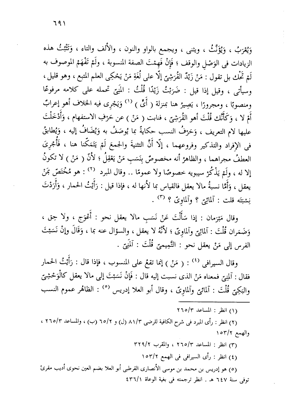 وقال السيرافي: (من) إنما تقع على المنسوب، فإذا قال: رأيت الحمار فقال: آلمني فمعناه من الذي نسبت إليه قال: فإن نسبت إلى ما لا يعقل كالوحشي والبكي قلت: آلمائي وآلماوي، وقال أبو العلا إدريس: الظاهر عموم النسب