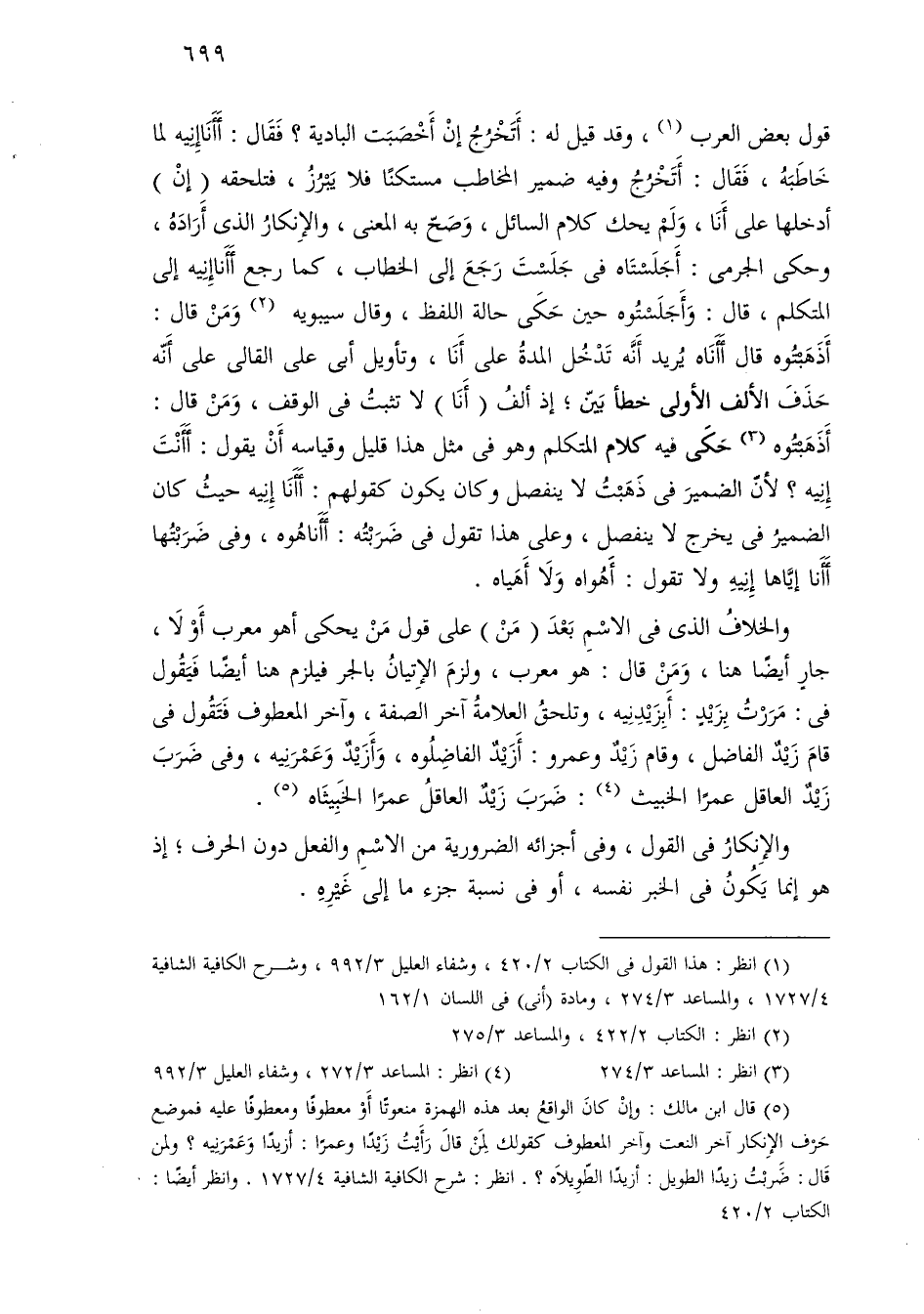 قول بعض العرب، وقد قيل له: أتخرج إن أخصبت البادية؟ فقال: أأنإنيه لما خاطبه، فقال: أتخرج وفيه ضمير المخاطب مستكنًا فلا يبرز، فتلحقه (إن) أدخلها على أنا، ولم يحك كلام السائل، وصح به المعنى، والإنكار الذي أراده، وحكى الجرمي: أجلستاه في جلست رجع إلى الخطاب، كما رجع أأنإنيه إلى المتكلم، قال: وأجلستوه حين حكى حالة اللفظ، وقال سيبويه ومن قال: أذهبتوه قال أأناه يريد أنه تدخل المدة على أنا، وتأويل أبي على القالي على أنه حذف الألف الأولى خطأ بين؛ إذ ألف (أنا) لا تثبت في الوقف، ومن قال: أذهبتوه حكى فيه كلام المتكلم وهو في مثل هذا قليل وقياسه أن يقول: أأنت إنيه؟ لأن الضمير في ذهبت لا ينفصل وكان يكون كقولهم: أأنا إنيه حيث كان الضمير في يخرج لا ينفصل، وعلى هذا تقول في ضربته: أأناهوه، وفي ضربتها أأنا إياها إنيه ولا تقول: أهواه ولا أهياه.