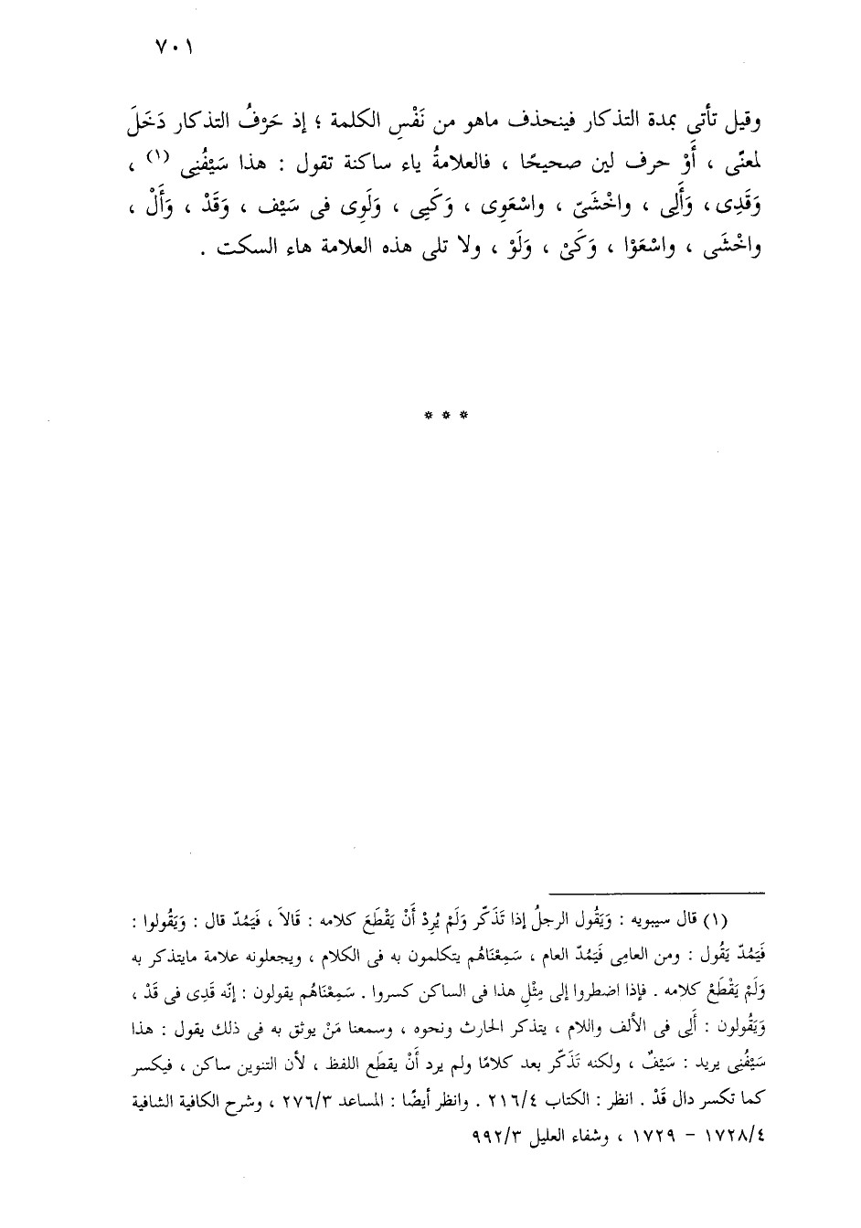وقيل تأتي بمدة التذكار فينحذف ما هو من نفس الكلمة؛ إذ حرف التذكار دخل لمعنى، أو حرف لين صحيحًا، فالعلامة ياء ساكنة تقول: هذا سيفنى، وقدى، وألى، واخشى، واسعوى، وكيى، ولوى في سيف، وقد، وأل، واخشى، واسعوا، وكي، ولو، ولا تلي هذه العلامة هاء السكت.