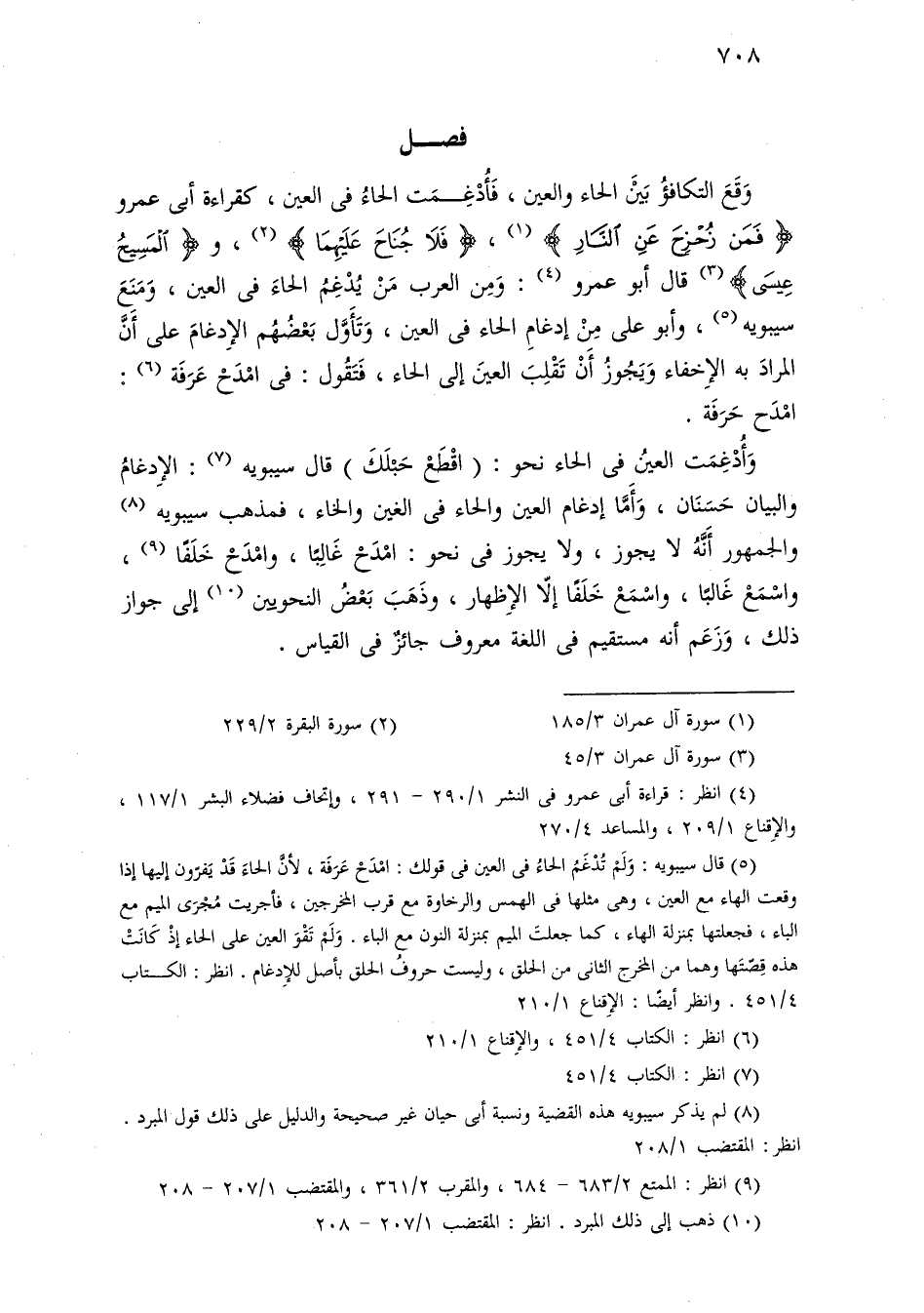 وأدغمت العين في الحاء نحو: (اقطع حبلك) قال سيبويه: الإدغام والبيان حسنان، وأما إدغام العين والحاء في الغين والخاء، فمذهب سيبويه والجمهور أنه لا يجوز، ولا يجوز في نحو: امدح غالبًا، وامدح خلفًا، واسمع غالبًا، واسمع خلفًا إلا الإظهار، وذهب بعض النحويين إلى جواز ذلك، وزعم أنه مستقيم في اللغة معروف جائز في القياس.