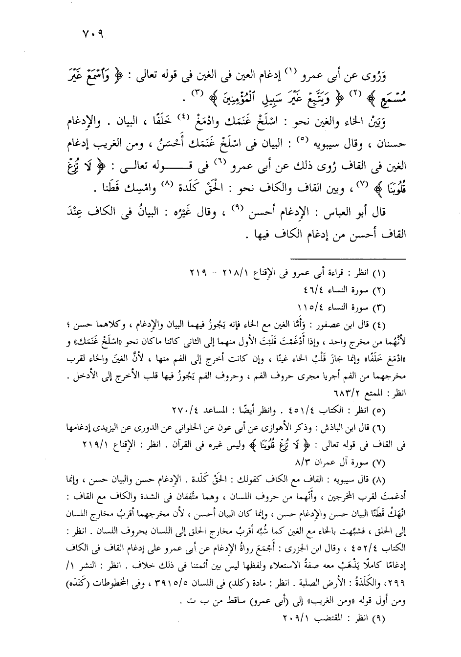 وبين الخاء والغين نحو: اسلخ غنمك وادمغ خلفًا، البيان. والإدغام حسنان، وقال سيبويه: البيان في اسلخ غنمك أحسن، ومن الغريب إدغام الغين في القاف روى ذلك عن أبي عمرو في قوله تعالى: [لا تزغ قلوبنا]، وبين القاف والكاف نحو: الحق كلدة وامسك قطنا.