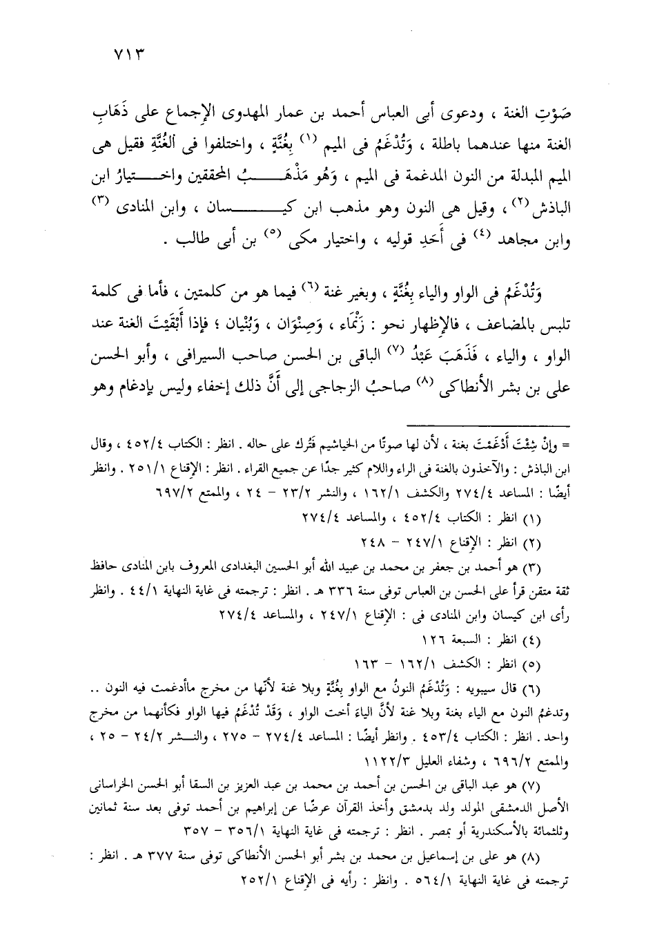 وتدغم في الواو والياء بغنة، وبغير غنة فيما هو من كلمتين، فأما في كلمة تلبس بالمضاعف، فالإظهار نحو: زنماء، وصنوان، وبنيان؛ فإذا أبقيت الغنة عند الواو، والياء، فذهب عبد الباقي بن الحسن صاحب السيرافي، وأبو الحسن علي بن بشر الأنطاكي صاحب الزجاجي إلى أن ذلك إخفاء وليس بإدغام وهو