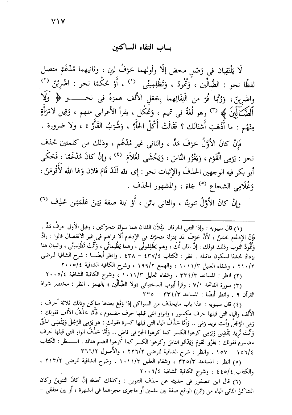 فإن كان الأول حرف مد، والثاني غير مدم، وذلك من كلمتين حذف نحو: يرمي القوم، ويغزو الناس، ويخشى الغلام، وإن كان مدغمًا، فحكى أبو بكر فيه الوجهين الحذف والإثبات نحو: إي الله لقد قام فلان وها الله لأقومن، وغلامي الشجاع جاء، والمشهور الحذف.