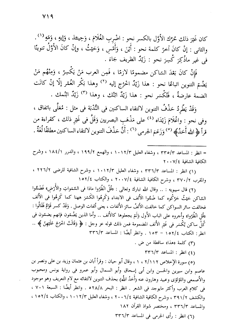 وقد يطرد حذف التنوين لالتقاء الساكنين في الندبة في مثل: معلى باتفاق، وفي نحو: واغلام زيداه على مذهب البصريين وقل في غير ذلك، كقراءة من قرأ [الله أحد] وزعم الجرمي: أن حذف التنوين لالتقاء الساكنين مطلقًا لغة.