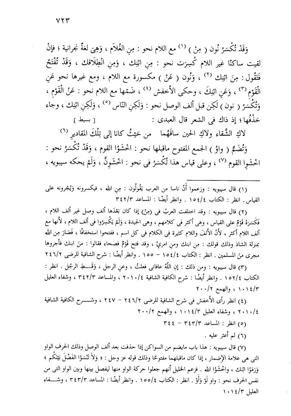 وقد تكسر نون (من) مع اللام نحو: من الغلام، وهي لغة نجرانية؛ فإن لقيت ساكنًا غير اللام كسرت نحو: من ابنك، ومن انطلاقك، وقد تفتح فتقول: من ابنك، ونون (عن) مكسورة مع اللام، ومع غيرها نحو عن القوم، وعن ابنك، وحكى الأخفش، ضمها مع اللام نحو: عن القوم، وتكسر (نون) لكن قبل ألف الوصل نحو: ولكن الناس، ولكن ابنك، وجاء حذفها؛ إذ ذاك في الشعر قال العبدي: