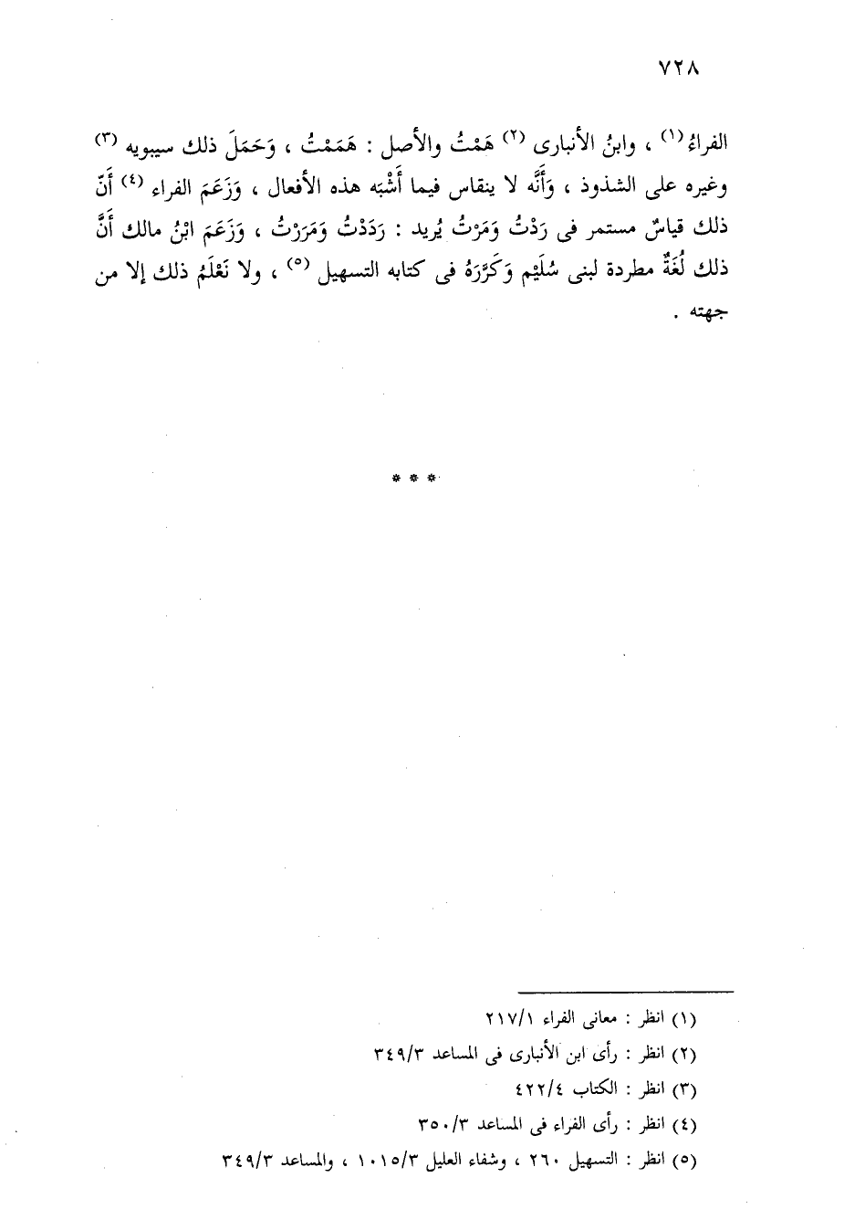 الفراء، وابن الأنباري همت والأصل: هممت، وحمل ذلك سيبويه وغيره على الشذوذ، وأنه لا ينقاس فيما أشبه هذه الأفعال، وزعم الفراء أن ذلك قياس مستمر في ردت ومرت يريد: رددت ومررت، وزعم ابن مالك أن ذلك لغة مطردة لبني سليم وكرره في كتابه التسهيل، ولا نعلم ذلك إلا من جهته.