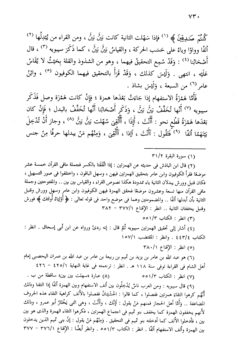 كنتم صادقين] فإذا سهلت الثانية كانت بين بين، ومن القراء من يبدلها ألفًا وواوًا وياءً على حسب الحركة، والقياس بين بين، كما ذكر سيبويه، قال أصحابنا: وقد سمع التحقيق فيهما، وهو من الشذوذ والقلة بحيث لا يقاس عليه، انتهى. وليس كذلك، وقد قرأ بالتحقيق فيهما الكوفيون، وابن عامر من السبعة، وليس بشاذ.