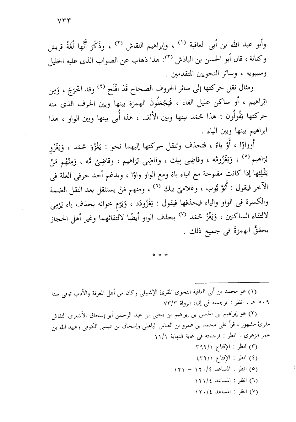 وأبو عبد الله بن أبي العافية، وإبراهيم النقاش، وذكر أنها لغة قريش وكنانة، قال أبو الحسن بن الباذش: هذا ذهاب عن الصواب الذي عليه الخليل وسيبويه، وسائر النحويين المتقدمين.