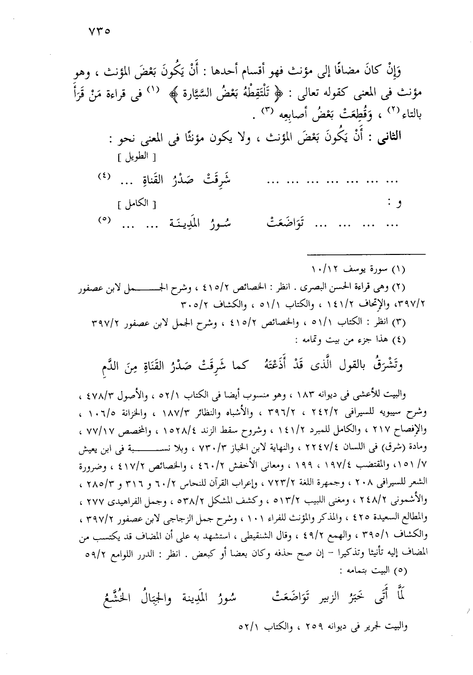 وإن كان مضافًا إلى مؤنث فهو أقسام أحدها: أن يكون بعض المؤنث، وهو مؤنث في المعنى كقوله تعالى: [تلتقطه بعض السيارة] في قراءة من قرأ بالتاء، وقطعت بعض أصابعه.