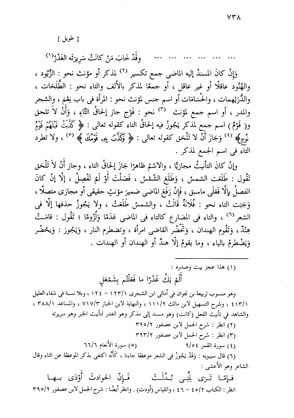 وإن كان المسند إليه الماضي جمع تكسير لمذكر أو مؤنث نحو: الزيود، والهنود عاقلاً أو غير عاقل، أو جمعًا لمذكر بالألف والتاء نحو: الطلحات، والدريهمات، والحسامات أو اسم جنس لمؤنث نحو: المرأة في باب نعم، والشجر والمدر، أو اسم جمع لمؤنث نحو: فوج جاز إلحاق التاء، وأن لا تلحق و (قوم) اسم جمع لمذكر يجوز فيه إلحاق التاء كقوله تعالى: [كذبت قبلهم قوم نوح] وجاز أن لا تلحق كقوله تعالى: [وكذب به قومك]، ولا تطرد التاء في اسم الجمع لمذكر.