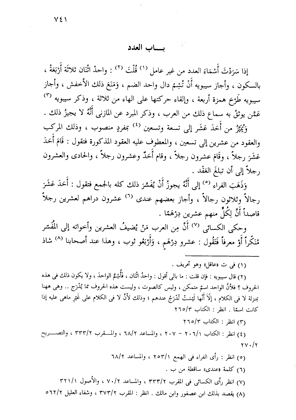 ويميز من أحد عشر إلى تسعة وتسعين بمفرد منصوب، وذلك المركب والعقود من عشرين إلى تسعين بمفرد منصوب، وذلك المركب والعقود من عشرين إلى تسعين، والمعطوف عليه العقود المذكورة فتقول: قام أحد عشر رجلاً، وقام عشرون رجلاً، وقام أحد وعشرون رجلاً، والحادي والعشرون رجلاً إلى أن تبلغ العقد.