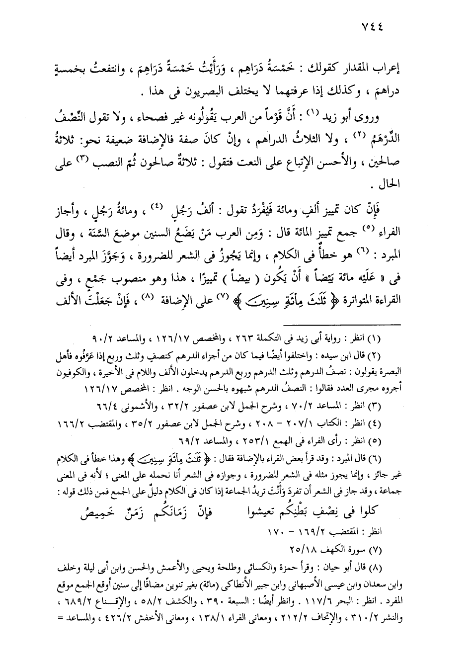 فإن كان تمييز ألف ومائة فيفرد تقول: ألف رجل، ومائة رجل، وأجاز الفراء جمع تمييز المائة قال: ومن العرب من يضع السنين موضع السنة، وقال المبرد: هو خطأ في الكلام، وإنما يجوز في الشعر للضرورة، وجوز المبرد أيضًا في «علية مائة بيضًا» أن يكون (بيضًا) تمييزًا، هذا وهو منصوب جمع، وفي القراءة المتواترة [ثلاث مائة سنين] على الإضافة، فإن جعلت الألف