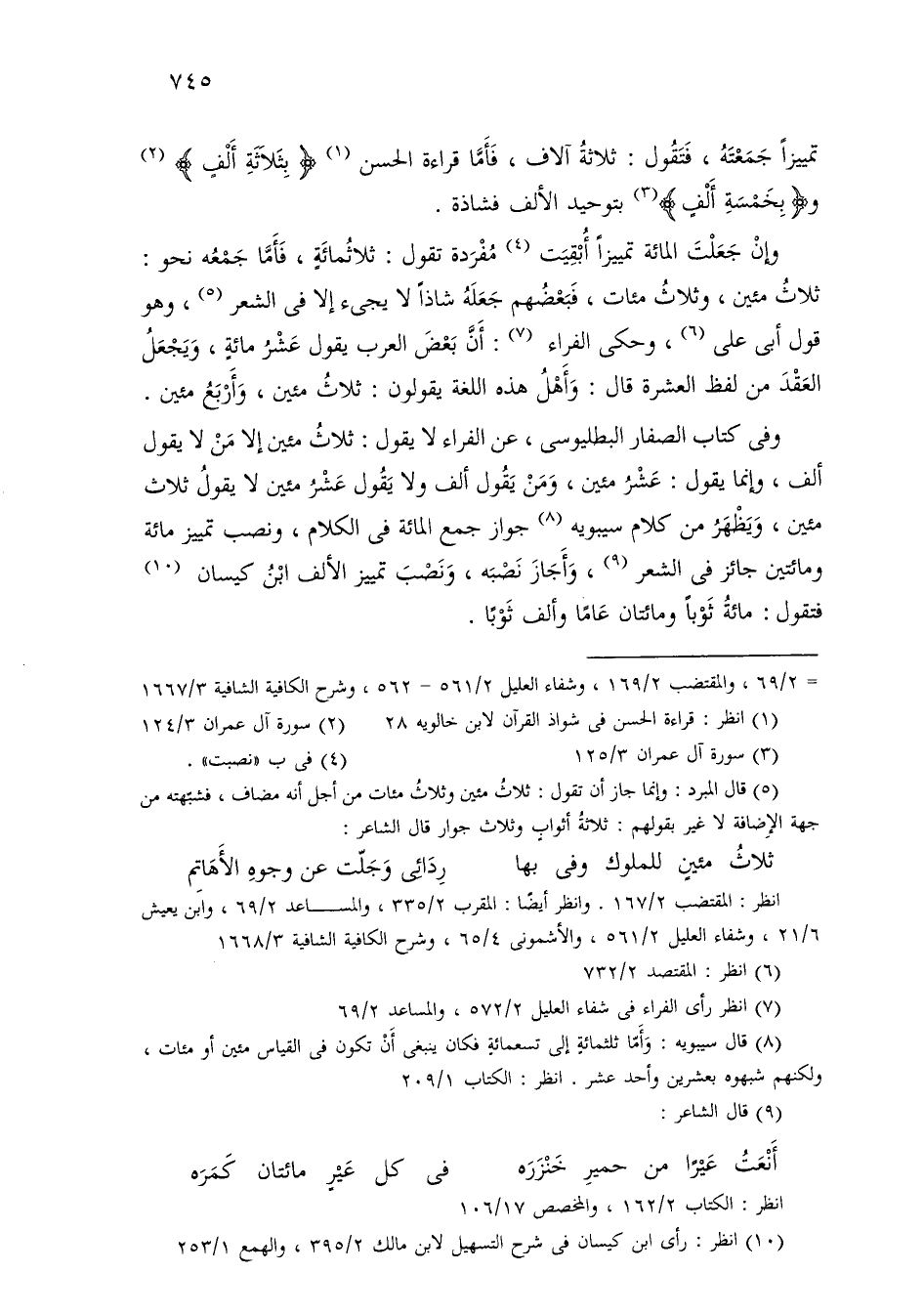 وفي كتاب الصفار البطليوسي، عن الفراء لا يقول: ثلاث مئين إلا من لا يقول ألف، وإنما يقول: عشر مئين، ومن يقول ألف ولا يقول عشر مئين لا يقول ثلاث مئين، ويظهر من كلام سيبويه جواز جمع المائة في الكلام، ونصب تمييز مائة ومائتين جائز في الشعر، وأجاز نصبه، ونصب تمييز الألف ابن كيسان فتقول: مائة ثوبًا ومائتان عامًا وألف ثوبًا.