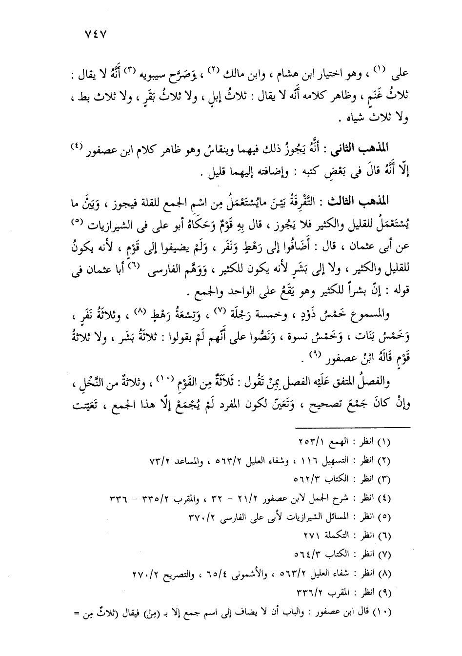 المذهب الثالث: التفرقة بين ما يستعمل من اسم الجمع للقلة فيجوز، وبين ما يستعمل للقليل والكثير فلا يجوز، قال به قوم وحكاه أبو علي في الشرازيات عن أبي عثمان، قال: أضافوا إلى رهط ونفر، ولم يضيفوا إلى قوم، لأنه يكون للقليل والكثير، ولا إلى بشر لأنه يكون للكثير، ووهم الفارسي أبا عثمان في قوله: إن بشرًا للكثير وهو يقع على الواحد والجمع.