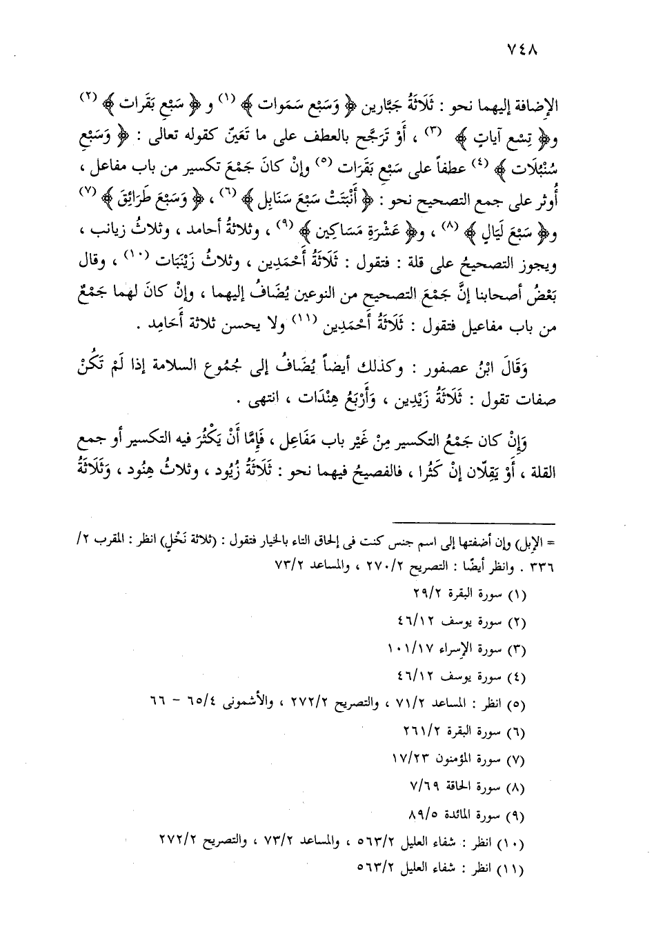 الإضافة إليهما نحو: ثلاثة جبارين [وسبع سموات] و [سبع بقرات] و [ـسع آيات]، أو ترجح بالعطف على ما تعين كقوله تعالى: [وسبع سنبلات] عطفًا على سبع بقرات وإن كان جمع تكسير من باب مفاعل، أوثر على جمع التصحيح نحو: [أنبتت سبع سنابل]، [وسبع طرائق] و [سبع ليال]، و [عشرة مساكين]، وثلاثة أحامد، وثلاث زيانب، ويجوز التصحيح على قلة: فتقول: ثلاثة أحمدين، وثلاث زينبات، وقال بعض أصحابنا إن جمع التصحيح من النوعين يضاف إليهما، وإن كان لهما جمع من باب مفاعيل فتقول: ثلاثة أحمدين ولا يحسن ثلاثة أحامد.