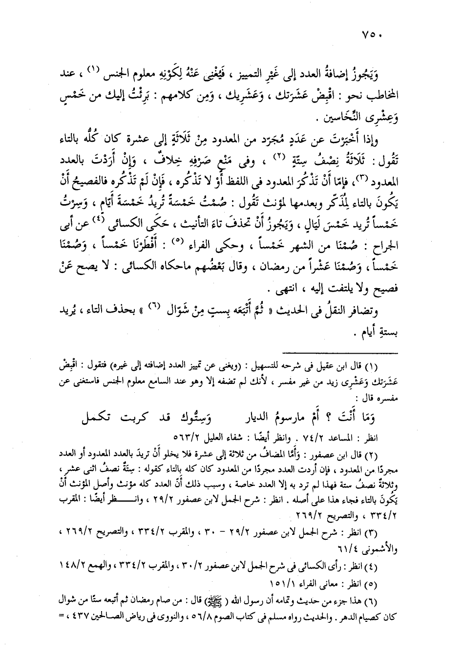 وإذا أخبرت عن عدد مجرد من المعدود من ثلاثة إلى عشرة كان كله بالتاء تقول: ثلاثة نصف ستة، وفي منع صرفه خلاف، وإن أردت بالعدد المعدود، فإما أن تذكر المعدود في اللفظ أو لا تذكره، فإن لم تذكره فالفصيح أن يكون بالتاء لمذكر وبعدمها لمؤنث تقول: صمت خمسة تريد خمسة أيام، وسرت خمسًا تريد خمس ليال، ويجوز أن تحذف تاء التأنيث، حكى الكسائي عن أبي الجراح: صمنا من الشهر خمسًا، وحكى الفراء: أفطرنا خمسًا، وصمنا خمسًا، وصمنا عشرًا من رمضان، وقال بعضهم ما حكاه الكسائي: لا يصح عن فصيح ولا يلتفت إليه، انتهى.