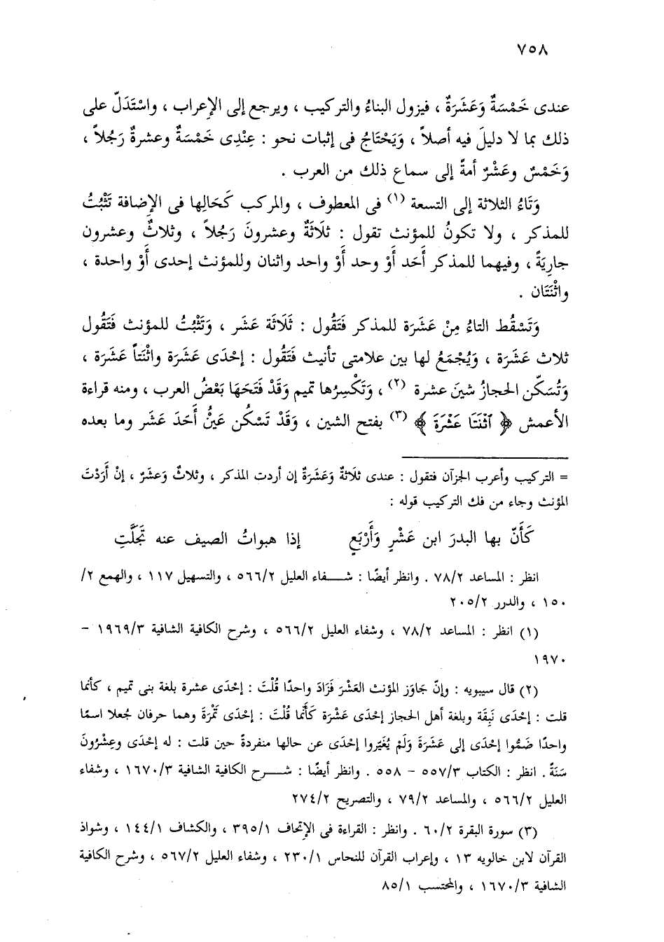 وتسقط التاء من عشرة للمذكر فتقول: ثلاثة عشر، وتثبت للمؤنث فتقول ثلاث عشرة، ويجمع لها بين علامتي تأنيث فتقول: إحدى عشرة واثنتا عشرة، وتسكن الحجاز شين عشرة، وتكسرها تميم وقد فتحها بعض العرب، ومنه قراءة الأعمش [اثنتا عشرة] بفتح الشين، وقد تسكن عين أحد عشر وما بعده