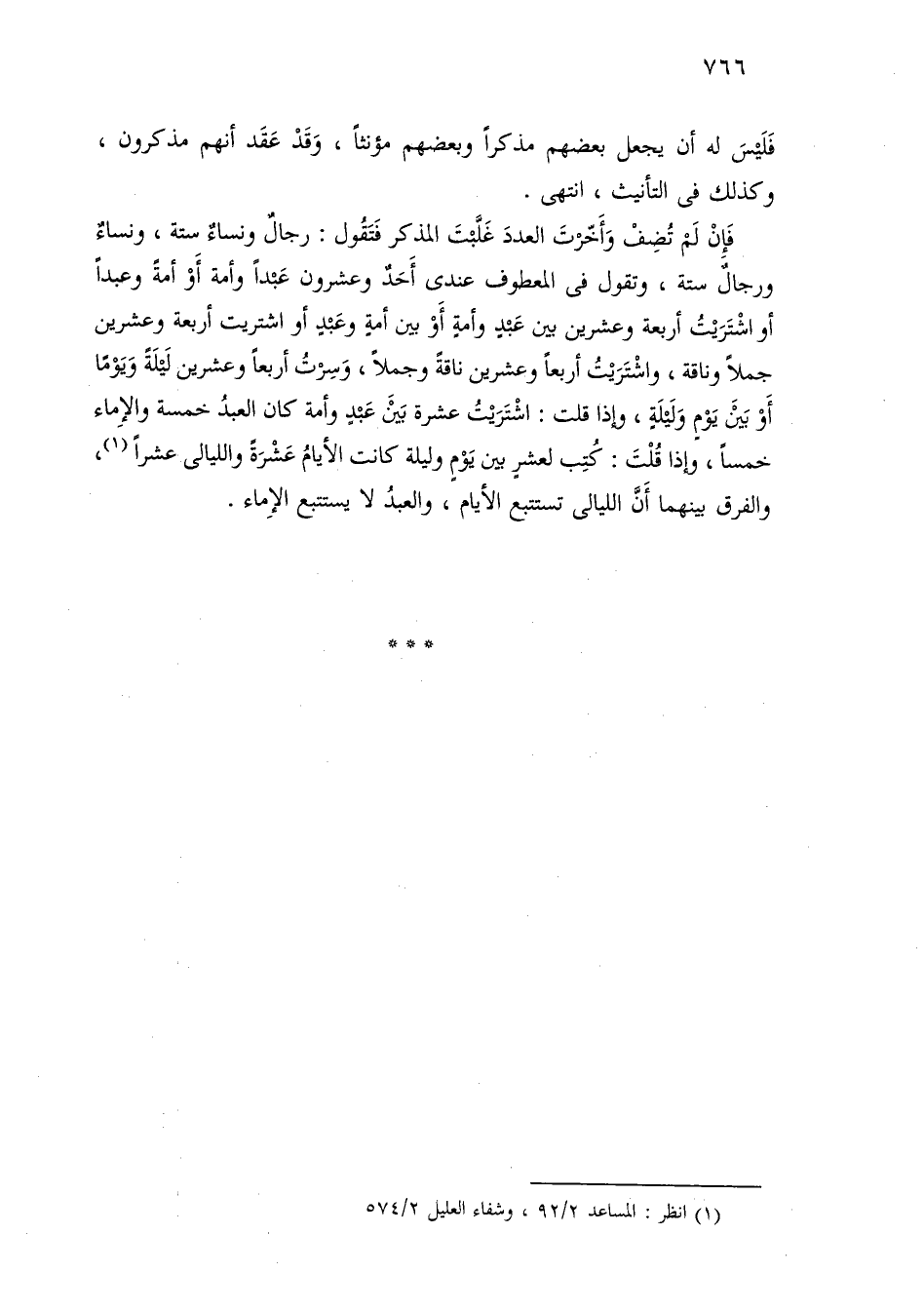فإن لم تضف وأخرت العدد غلبت المذكر فتقول: رجال ونساء ستة، ونساء ورجال ستة، وتقول في المعطوف عندي أحد وعشرون عبدًا وأمة أو أمة وعبدا أو اشتريت أربعة وعشرين بين عبد وأمة أو بين أمة وعبد أو اشتريت أربعة وعشرين جملاً وناقة، واشتريت أربعًا وعشرين ناقة وجملاً، وسرت أربعًا وعشرين ليلة ويومًا أو بين يوم وليلة، وإذا قلت: اشتريت عشرة بين عبد وأمة كان العبد خمسة والإماء خمسًا، وإذا قلت: كتب لعشر بين يوم وليلة كانت الأيام عشرة والليالي عشرًا، والفرق بينهما أن الليالي تستتبع الأيام، والعبد لا يستتبع الإماء.