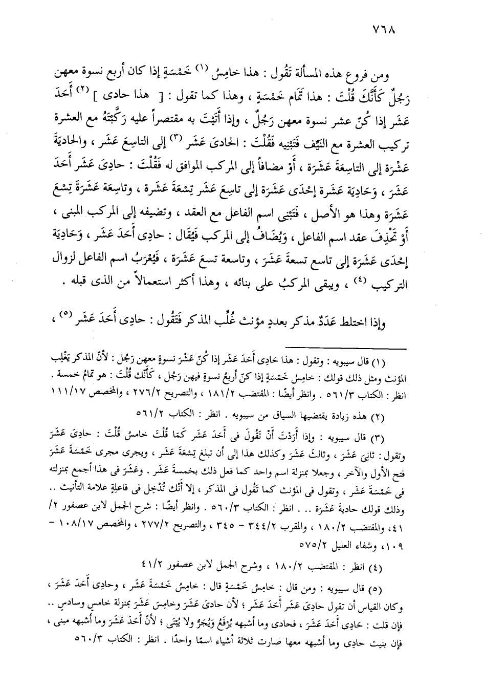 ومن فروع هذه المسألة تقول: هذا خامس خمسة إذا كان أربع نسوة معهن رجل كأنك قلت: هذا تمام خمسة، وهذا كما تقول: [هذا حادي] أحد عشر إذا كن عشر نسوة معهن رجل، وإذا أتيت به مقتصرًا عليه ركبته مع العشرة تركيب العشرة مع النيف فتبنيه فقلت: الحادي عشر إلى التاسع عشر، والحادية عشرة إلى التاسعة عشرة، أو مضاعفًا إلى المركب الموافق له فقلت: حادي عشر أحد عشر، وحادية عشرة إحدى عشرة إلى تاسع عشر تسعة عشرة، وتاسعة عشرة تسع عشرة وهذا هو الأصل، فتبنى اسم الفاعل مع العقد، وتضيفه إلى المركب المبني، أو تحذف عقد اسم الفاعل، ويضاف إلى المركب فيقال: حادي أحد عشر، وحادية إحدى عشرة إلى تاسع تسعة عشر، وتاسعة تسع عشر، فيعرب اسم الفاعل لزوال التركيب، ويبقى المركب على بنائه، وهذا أكثر استعمالاً من الذي قبله.