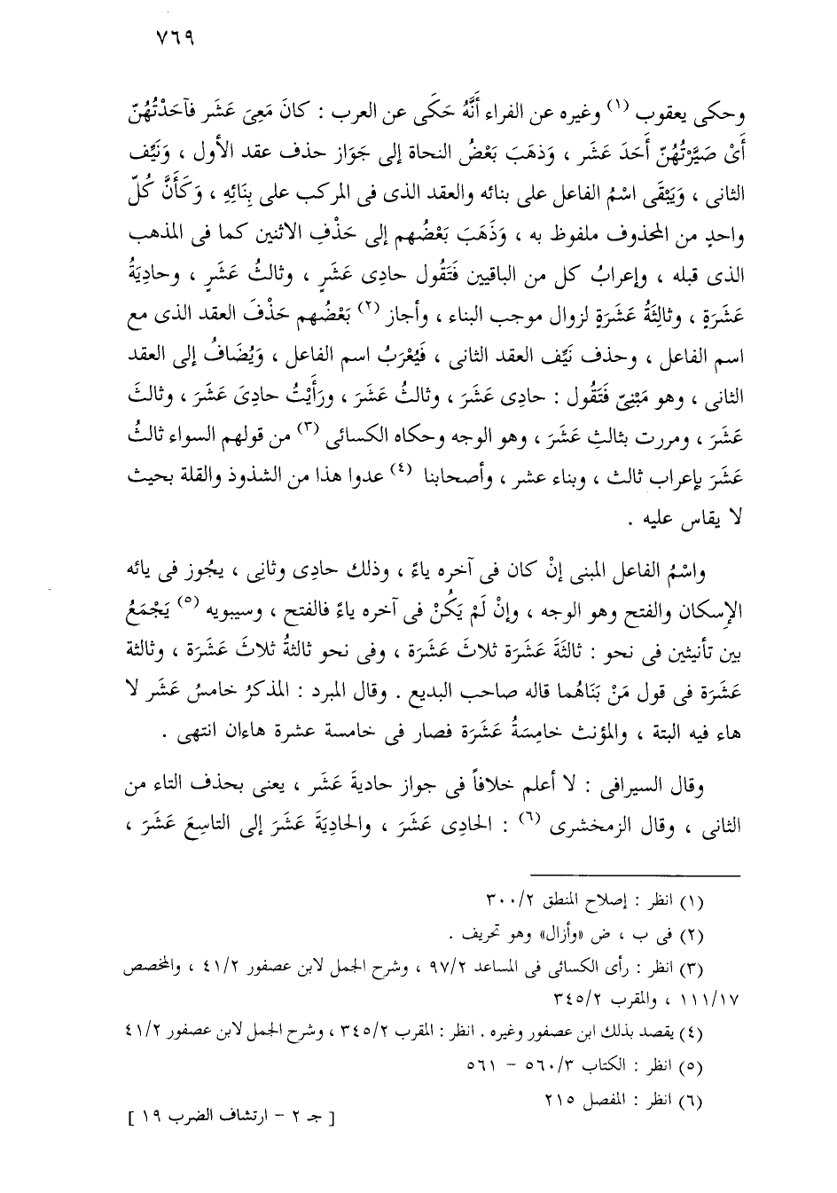 وقال السيرافي: لا أعلم خلافًا في جواز حادية عشر، يعني بحذف التاء من الثاني، وقال الزمخشري: الحادي عشر، والحادية عشر إلى التاسع عشر،