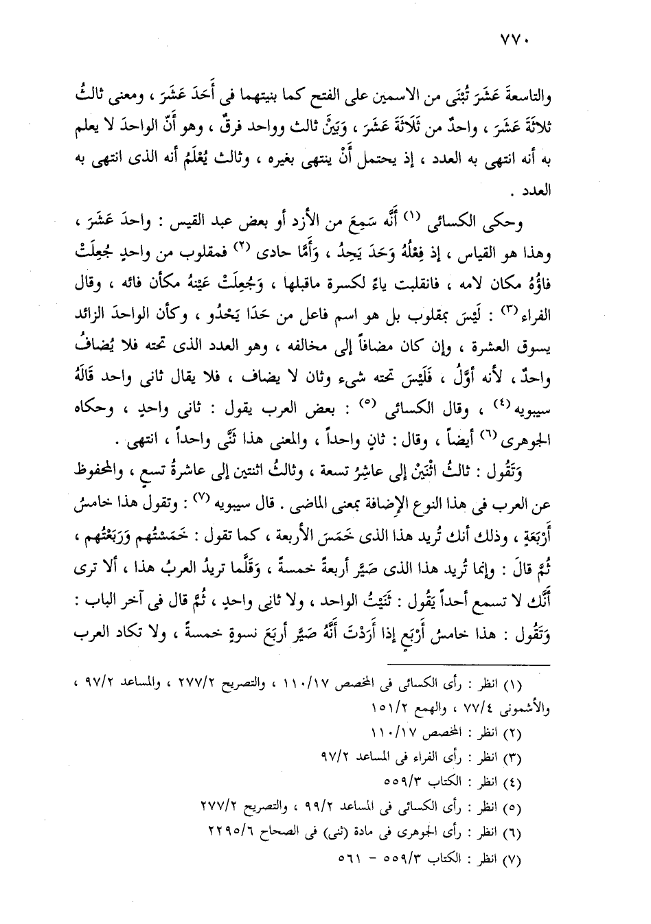 وتقول: ثالث اثنين إلى عاشر تسعة، وثالث اثنتين إلى عاشرة تسع، والمحفوظ عن العرب في هذا النوع الإضافة بمعنى الماضي. قال سيبويه: وتقول هذا خامس أربعة، وذلك أنك تريد هذا الذي خمس الأربعة، كما تقول: خمستهم وربعتهم، ثم قال: وإنما تريد هذا الذي صير أربعة خمسة، وقلما تريد العرب هذا، ألا ترى أنك لا تسمع أحدًا يقول: ثنيت الواحد، ولا ثاني واحد، ثم قال في آخر الباب: وتقول: هذا خامس أربع إذا أردت أنه صير أربع نسوة خمسة، ولا تكاد العرب