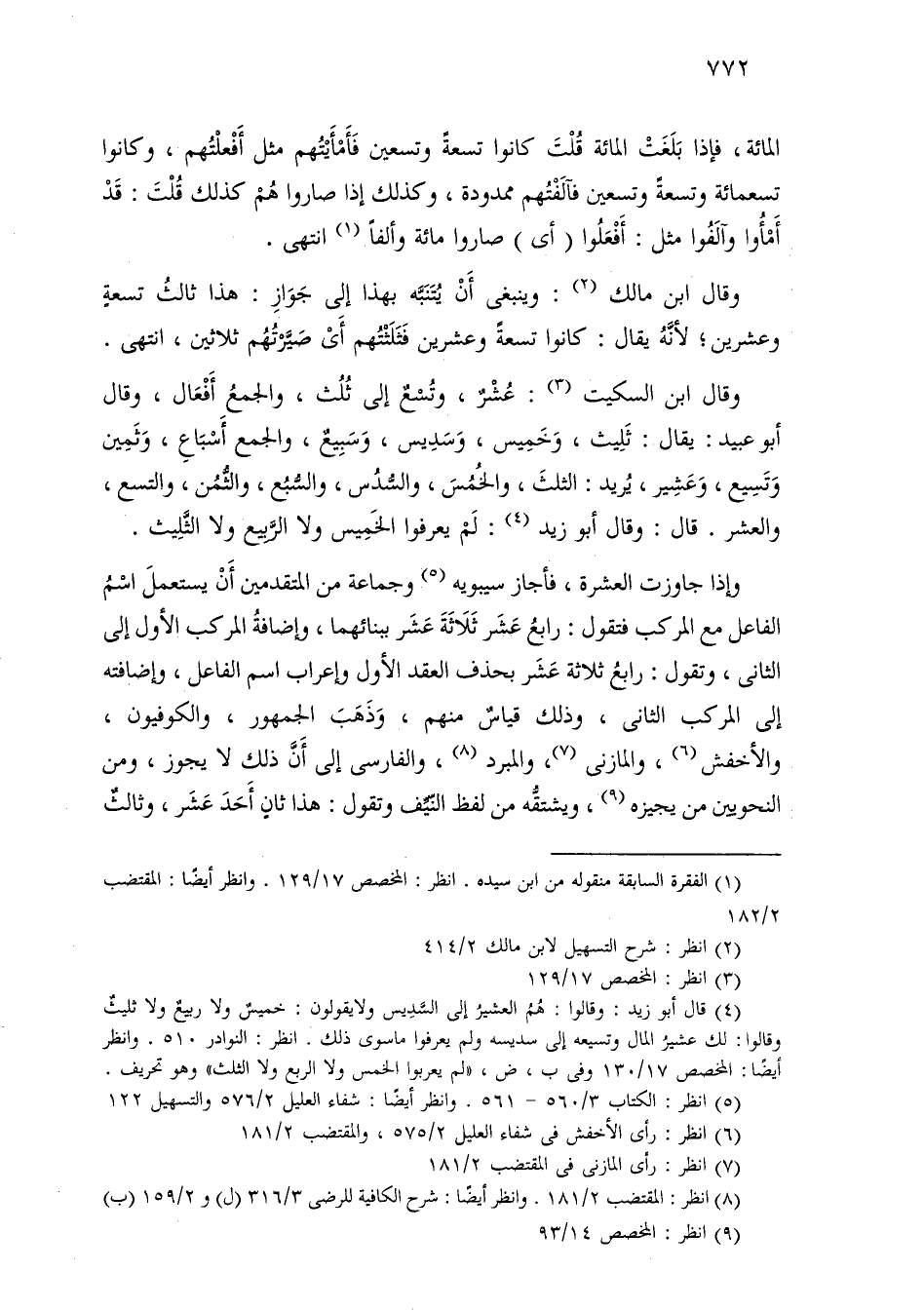 وقال ابن مالك: وينبغي أن يتنبه بهذا إلى جواز: هذا ثالث تسعة وعشرين؛ لأنه يقال: كانوا تسعة وعشرين فثلثتهم أي صيرتهم ثلاثين، انتهى.