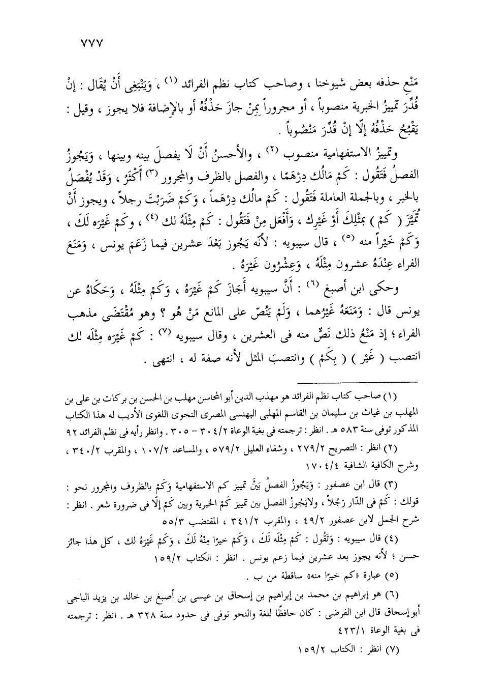 وتمييز الاستفهامية منصوب، والأحسن أن لا يفصل بينه وبينها، ويجوز الفصل فتقول: كم مالك درهمًا، والفصل بالظرف والمجرور أكثر، وقد يفصل بالخبر، وبالجملة العاملة فتقول: كم مالك درهمًا، وكم ضربت رجلا، ويجوز أن تميز (كم) بمثلك أو غيرك، وأفعل من فتقول: كم مثله لك، وكم غيره لك، وكم خيرًا منه، قال سيبويه: لأنه يجوز بعد عشرين فيما زعم يونس، ومنع الفراء عنده عشرون مثله، وعشرون غيره.