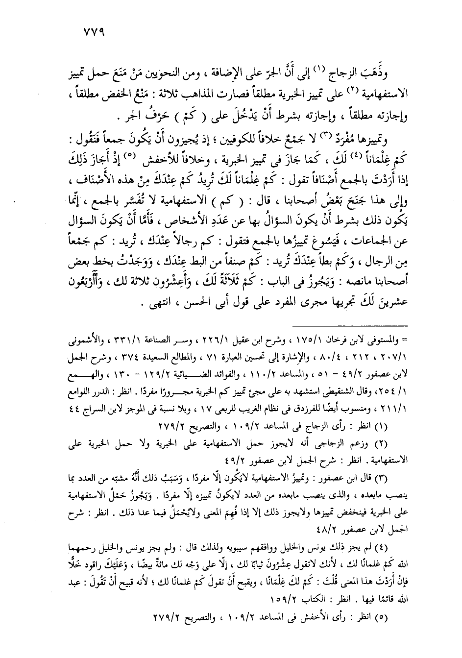 وذهب الزجاج إلى أن الجر على الإضافة، ومن النحويين من منع حمل تمييز الاستفهامية على تمييز الخبرية مطلقًا فصارت المذاهب ثلاثة: منع الخفض مطلقًا، وإجازته مطلقًا، وإجازته بشرط أن يدخل على (كم) حرف الجر.