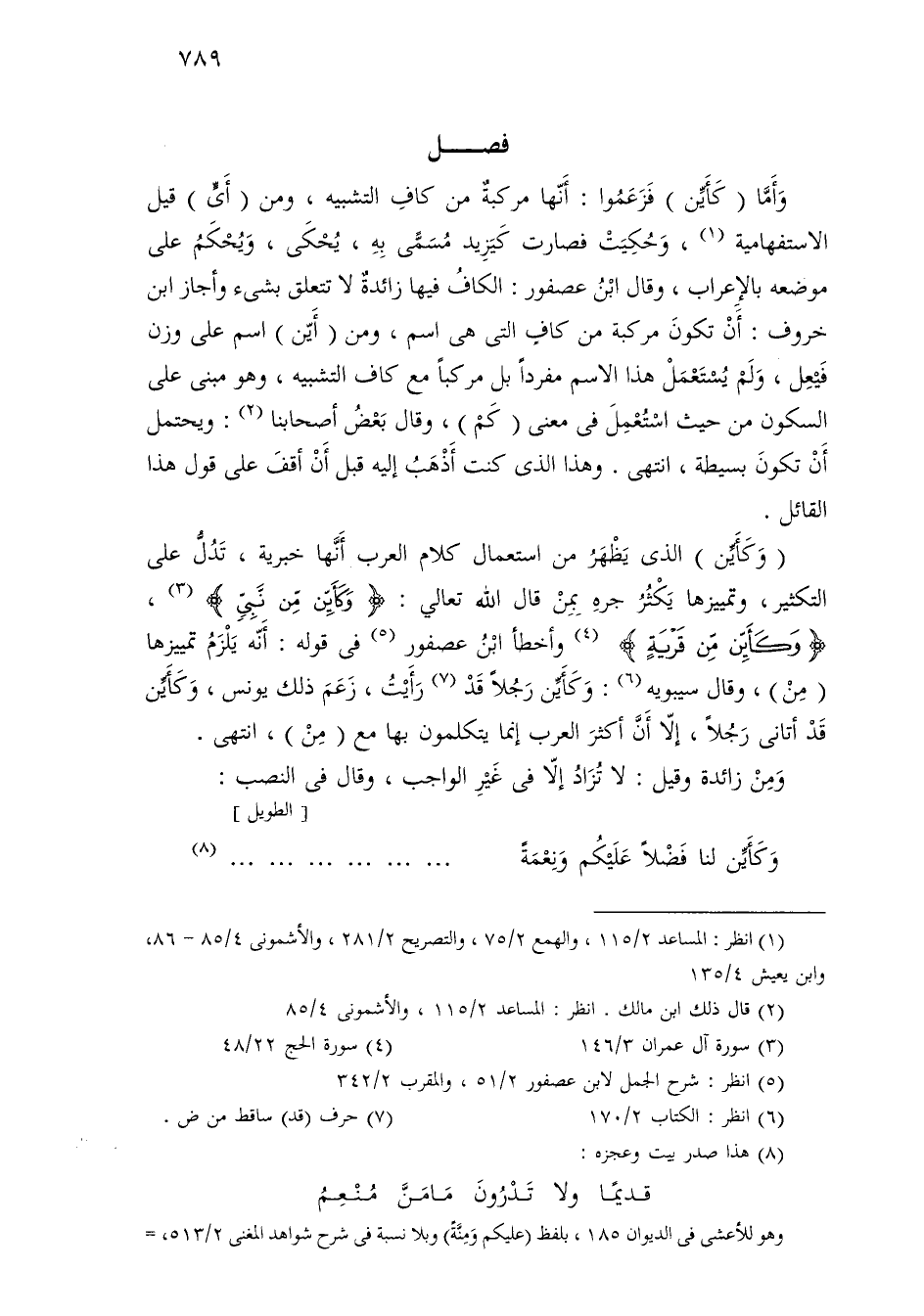 (وكأين) الذي يظهر من استعمال كلام العرب أنها خبرية، تدل على التكثير، وتمييزها يكثر جره بمن قال الله تعالى: [وكأين من نبي]، [وكأين من قرية]، وأخطأ ابن عصفور في قوله: أنه يلزم تمييزها (من)، وقال سيبويه: وكأين رجلا قد رأيت، زعم ذلك يونس، وكأين قد أتاني رجلاً، إلا أن أكثر العرب إنما يتكلمون بها مع (من)، انتهى.