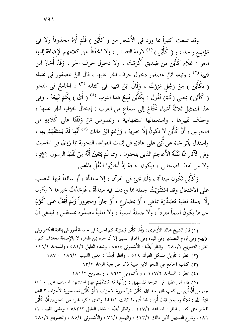 وقد تتبعت كثيرًا مما ورد في الأشعار من (كأين) فلم أره محذوفًا ولا في موضع واحد، و (كأين) لازمه التصدير، ولا يحفظ من كلامهم الإضافة إليها نحو: غلام كأين من صديق أكرمت، ولا دخول حرف الجر، وقد أجاز ابن قتيبة، وتبعه ابن عصفور دخول حرف الجر عليها، قال ابن عصفور في تمثيله (بكأين) من رجل مررت، وقال ابن قتيبة في كتابه: الجامع في النحو (كأين) بمعنى (كم) تقول: بكأين تبيع هذا الثوب (أي) بكم تبيعه، وفي هذا التمثيل ثلاثة أشياء تحتاج إلى سماع من العرب: إدخال حرف الجر عليها، وحذف تمييزها، واستعمالها استفهامية، ونصوص من وقفنا على كلامه من النحويين، أن كأين لا تكون إلا خبرية، وزعم ابن مالك أنها قد يستفهم بها، واستدل بأثر جاء عن أبي علي عادته في إثبات القواعد النحوية بما روى في الحديث وفي الآثار مما نقله الأعاجم الذين يلحنون، ومما لم يتعين أنه من لفظ الرسول (، ولا من لفظ الصحابي، فيكون حجة إذ أجازوا النقل بالمعنى.