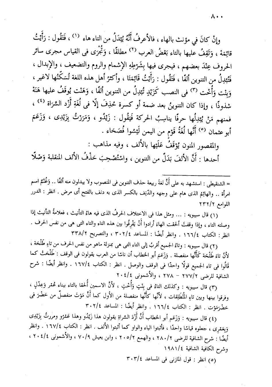 وإن كان في مؤنث بالهاء، فالأعرف أنه يبدل من التاء هاء، فتقول: رأيت قائمة، وتقف عليها بالتاء بعض العرب مطلقًا، وتجرى في القياس مجرى سائر الحروف عند بعضهم، فيجرى فيها بشرطه الإشمام والروم والتضعيف، والإبدال، فتبدل من التنوين ألفًا، فتقول: رأيت قائمتا، وأكثر أهل هذه اللغة تسكنها لا غير، وبنت وأخت في النصب كزيد تبدل من التنوين ألفًا، وهنت يوقف عليها هنه شذوذًا، وإذا كان التنوين بعد ضمة أو كسرة حذف غلا في لغة أزد السراة، فمنهم من يبدلها حرفًا يناسب الحركة فيقول: زيدو، ومررت بزيدى، وزعم أبو عثمان أنها لغة قوم من اليمن ليسوا فصحاء.