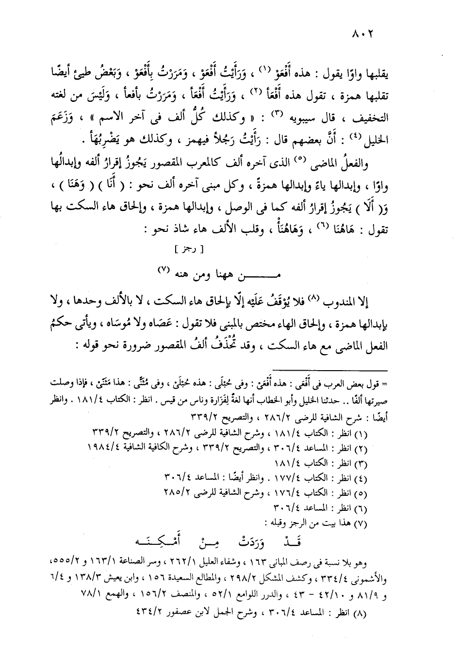 والفعل الماضي الذي آخره ألف كالمعرب المقصور يجوز إقرار ألفه وإبدالها واوًا، وإبدالها ياءً وإبدالها همزة، وكل مبني آخره ألف نحو: (أنا) (وهنا)، و (ألا) يجوز إقرار ألفه كما في الوصل، وإبدالها همزة، وإلحاق هاء السكت بها تقول: هاهنا، وهاهنأ، وقلب الألف هاء شاذ نحو: