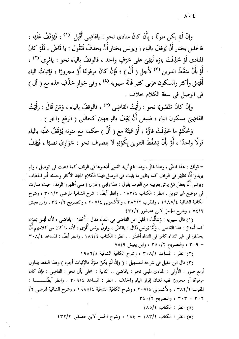 وإن لم يكن منونًا، بأن كان منادي نحو: يا قاضي أقبل، فيوقف عليه، فالخليل يختار أن يوقف بالياء، ويونس يختار أن يحذف فتقول: يا قاض، فلو كان المنادي لو حذفت ياؤه لبقى على حرف واحد، فالوقف بالياء نحو: يا مرى، أو بأن سقط التنوين لأجل (أل)؛ فإن كان مرفوعًا أو مجرورًا، فإثبات الياء أقيس وأكثر والسكون عربي كثير قاله سيبويه، وفي جواز حذف هذه مع (أل) في الوصل في سعة الكلام خلاف.