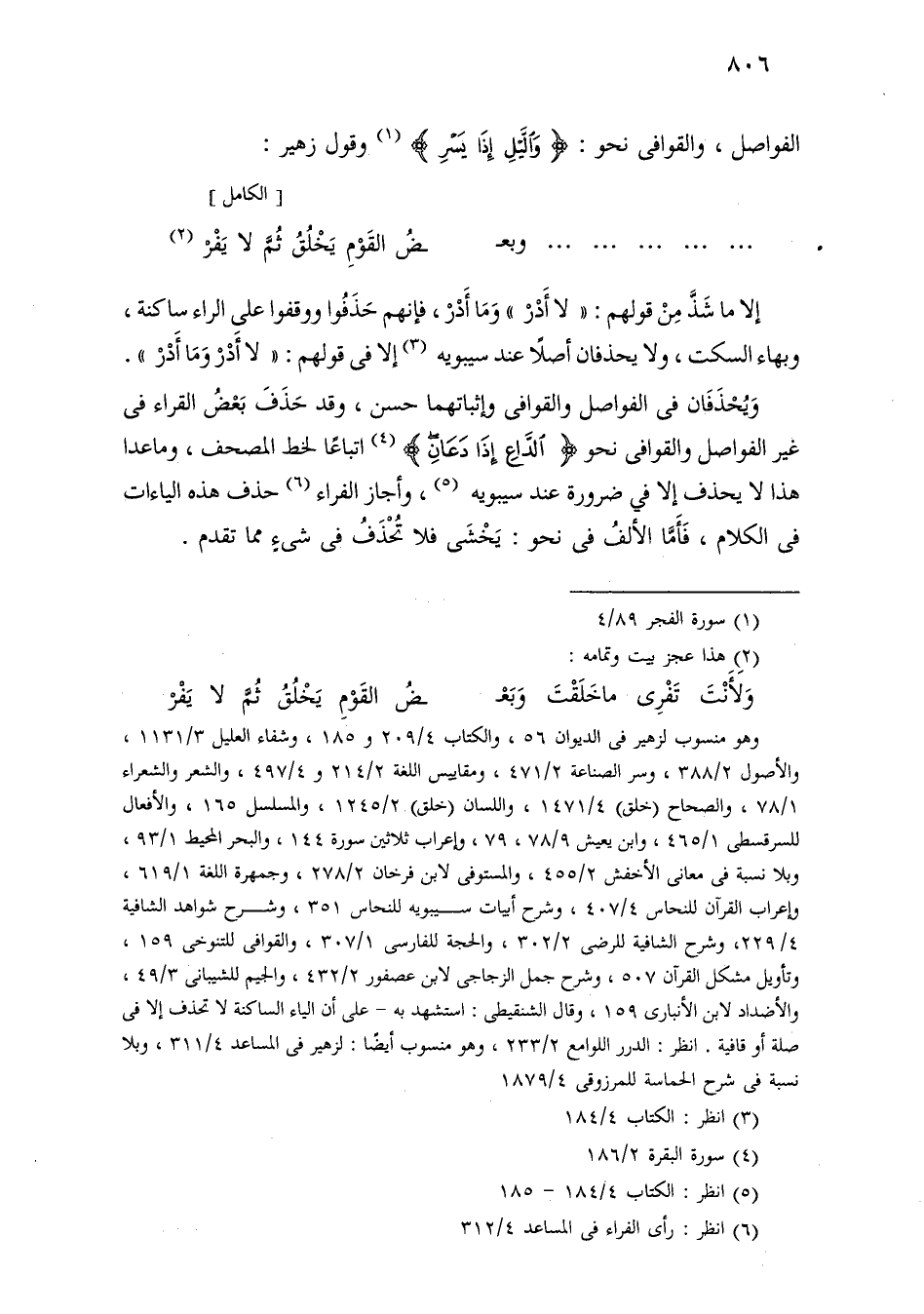 ويحذفان في الفواصل والقوافي وإثباتهما حسن، وقد حذف بعض القراء في غير الفواصل والقوافي نحو «الداع إذا دعان» اتباعًا لخط المصحف، وما عدا هذا لا يحذف إلا في ضرورة عند سيبويه، وأجاز الفراء حذف هذه الياءات في الكلام، فأما الألف في نحو: يخشى فلا تحذف في شيء مما تقدم.