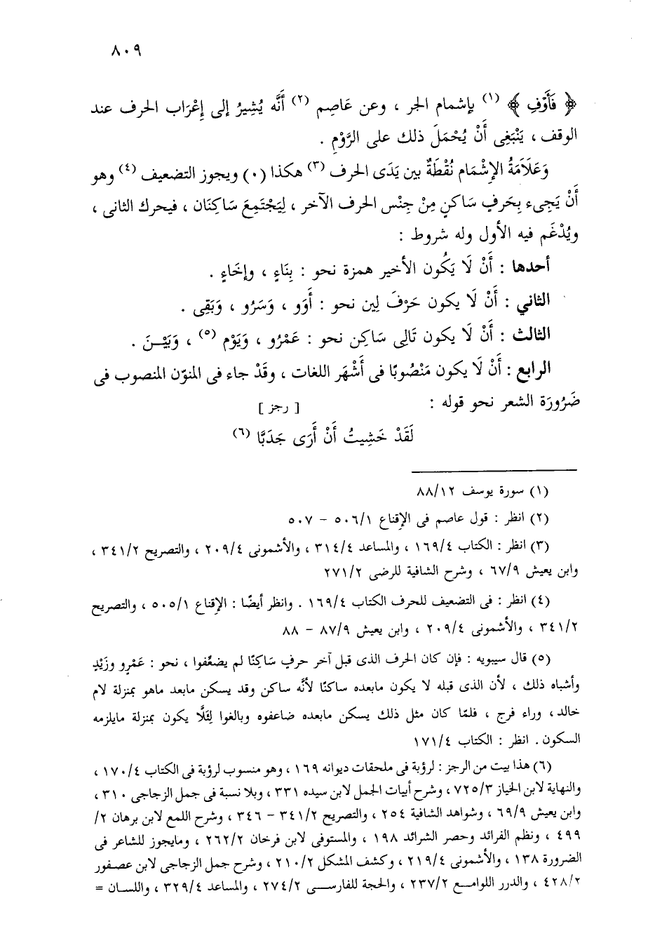 وعلامة الإشمام نقطة بين يدي الحرف هكذا (.) ويجوز التضعيف وهو أن يجيء بحرف ساكن من جنس الحرف الآخر، ليجتمع ساكنان، فيحرك الثاني، ويدغم فيه الأول وله شروط: