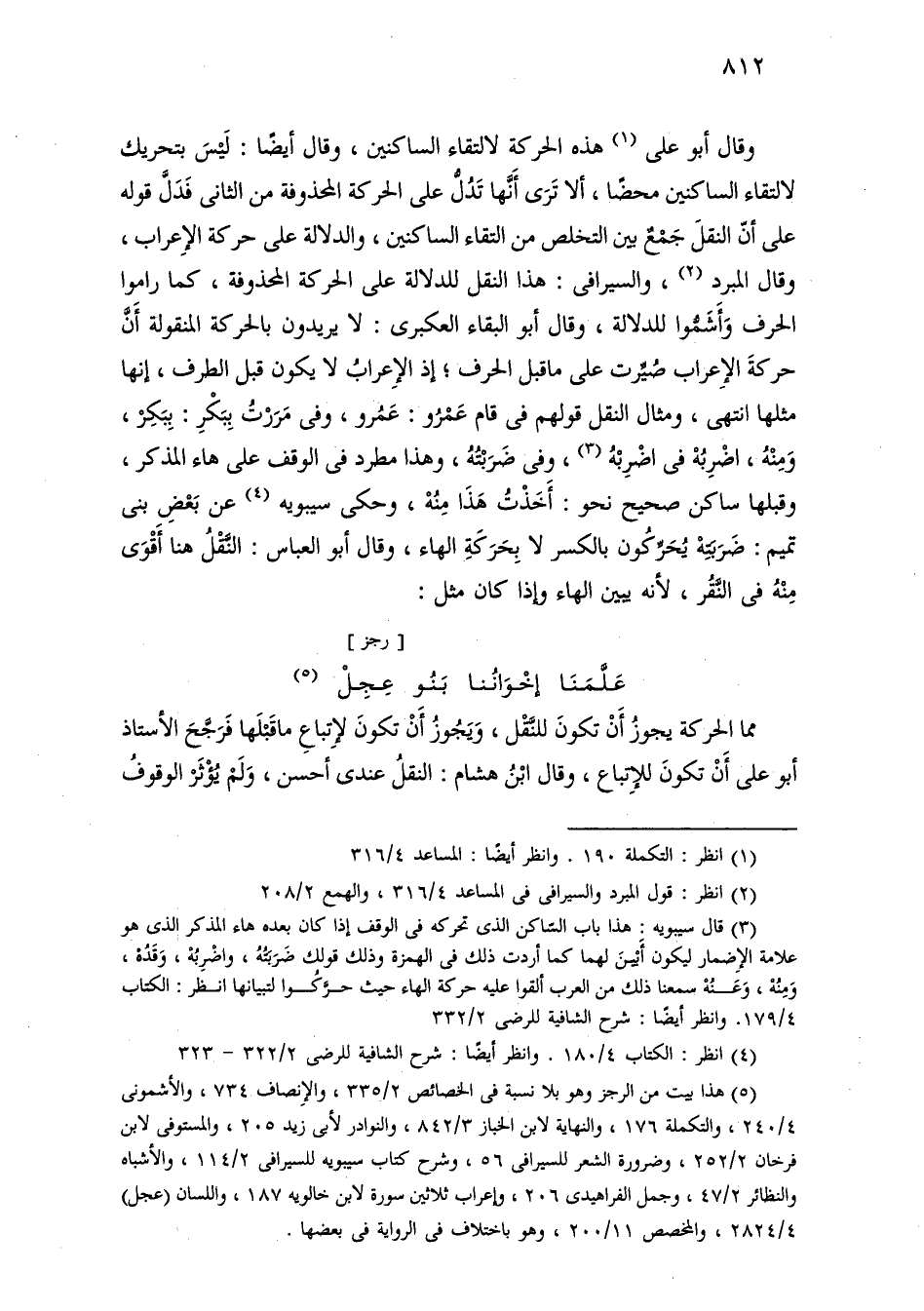 وقال أبو علي هذه الحركة لالتقاء الساكنين، وقال أيضًا: ليس بتحريك لالتقاء الساكنين محضًا، ألا ترى أنها تدل على الحركة المحذوفة من الثاني فدل قوله على أن النقل جمع بين التخلص من التقاء الساكنين، والدلالة على حركة الإعراب، وقال المبرد، والسيرافي: هذا النقل للدلالة على الحركة المحذوفة، كما راموا الحرف وأشموا للدلالة، وقال أبو البقاء العكبري: لا يريدون بالحركة المنقولة أن حركة الإعراب صيرت على ما قبل الحرف؛ إذ الإعراب لا يكون قبل الطرف، إنها مثلها انتهى، ومثال النقل قولهم في قام عمرو: عمرو، وفي مررت ببكر: ببكر، ومنه، اضربه في اضربه، وفي ضربته، وهذا مطرد في الوقف على هاء المذكر، وقبلها ساكن صحيح نحو: أخذت هذا منه، وحكى سيبويه عن بعض بني تميم: ضربته يحركون بالكسر لا بحركة الهاء، وقال أبو العباس: النقل هنا أقوى منه في النقر، لأنه يبين الهاء وإذا كان مثل: