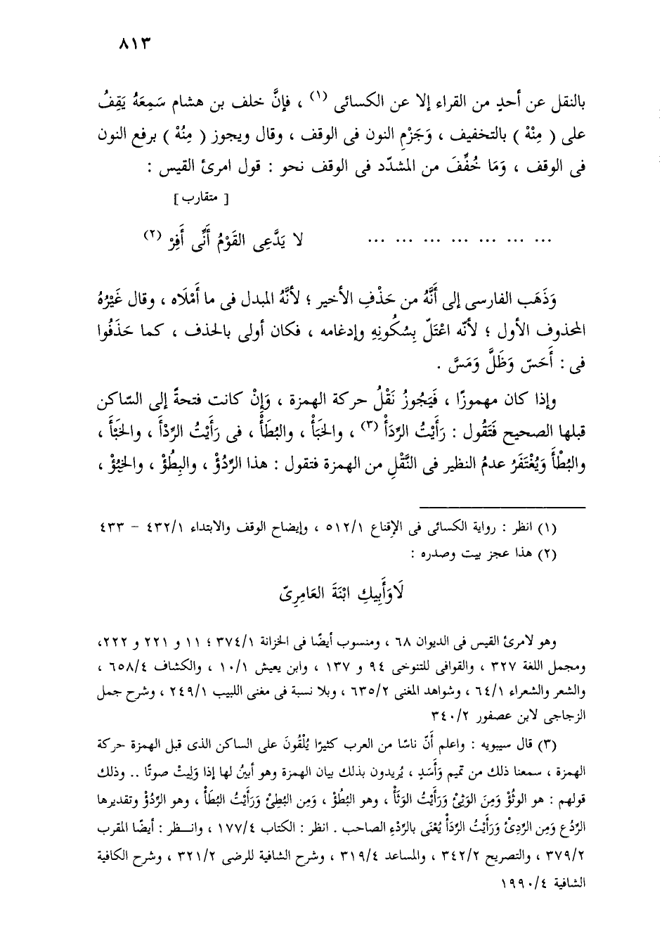 وإذا كان مهموزًا، فيجوز نقل حركة الهمزة، وإن كانت فتحة إلى الساكن قبلها الصحيح فتقول: رأيت الردأ، والخبأ، والبطأ، في رأيت الردأ، والخبأ، والبطأ ويغتفر عدم النظير في النقل من الهمزة فتقول: هذا الردؤ، والبطؤ، والخيؤ،