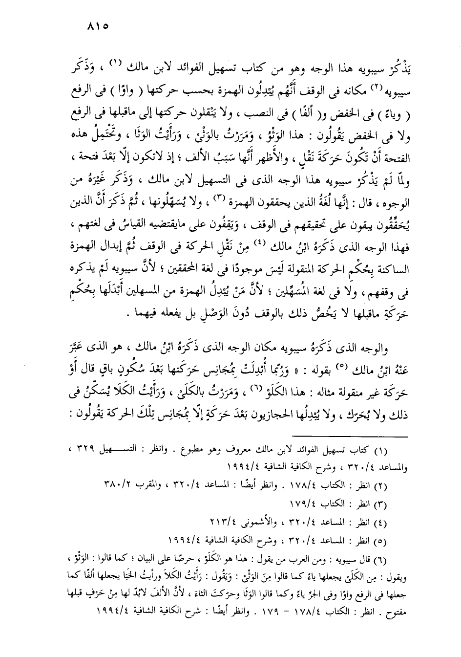 يذكر سيبويه هذا الوجه وهو من كتاب تسهيل الفوائد لابن مالك، وذكر سيبويه مكانه في الوقف أنهم يبدلون الهمزة بحسب حركتها (واوًا) في الرفع (وياءً) في الخفض و (ألفًا) في النصب، ولا ينقلون حركتها إلى ما قبلها في الرفع ولا في الخفض يقولون: هذا الوثو، ومررت بالوثى، ورأيت الوثا، وتحتمل هذه الفتحة أن تكون حركة نقل، والأظهر أنها سبب الألف؛ إذ لا تكون إلا بعد فتحة، ولما لم يذكر سيبويه هذا الوجه الذي في التسهيل لابن مالك، وذكر غيره من الوجوه، قال: إنها لغة الذين يحققون الهمزة، ولا يسهلونها، ثم ذكر أن الذين يحققون يبقون على تحقيقهم في الوقف، ويقفون على ما يقتضيه القياس في لغتهم، فهذا الوجه الذي ذكره ابن مالك من نقل الحركة في الوقف ثم إبدال الهمزة الساكنة بحكم الحركة المنقولة ليس موجودًا في لغة المحققين؛ لأن سيبويه لم يذكره في وقفهم، ولا في لغة المسهلين؛ لأن من يبدل الهمزة من المسهلين أبدلها بحكم حركة ما قبلها لا يخص ذلك بالوقف دون الوصل بل يفعله فيهما.