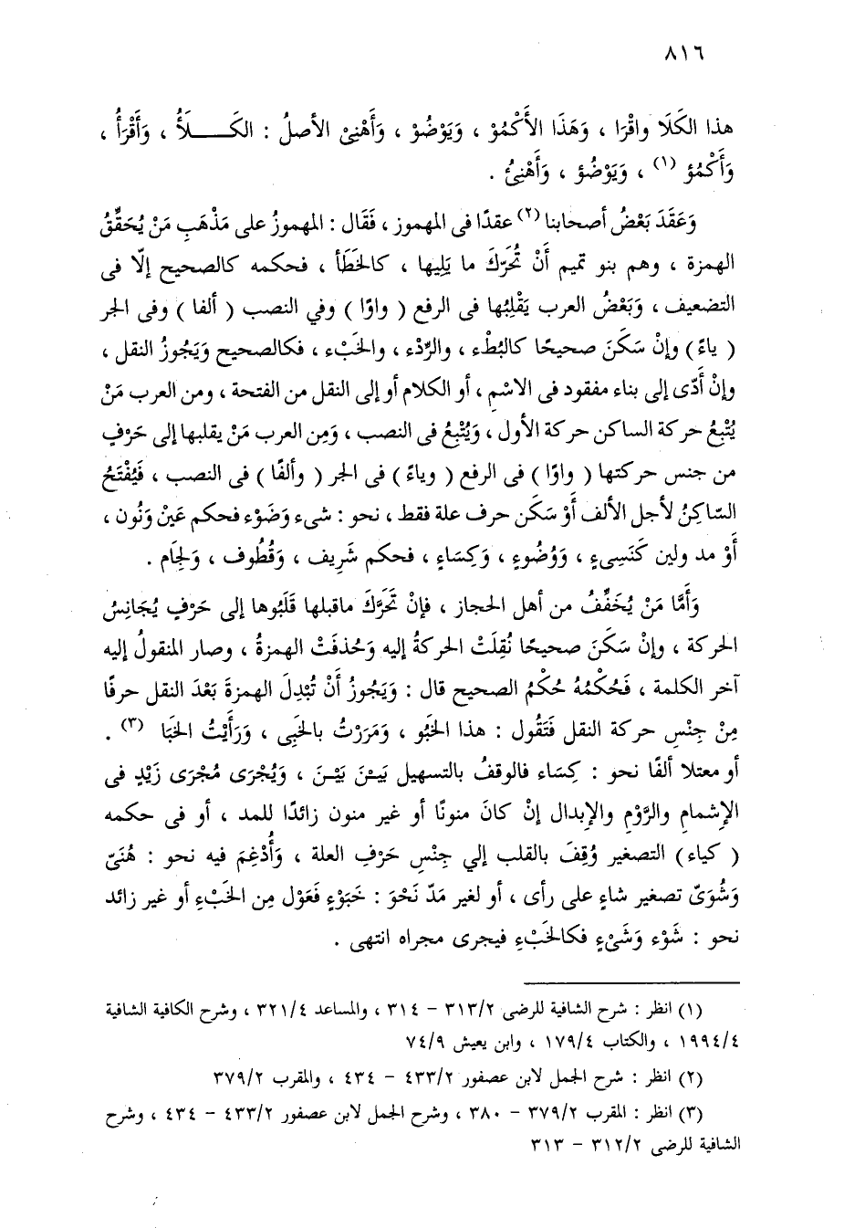 وعقد بعض أصحابنا عقدًا في المهموز، فقال: المهموز على مذهب من يحقق الهمزة، وهم بنو تميم أن تحرك ما يليها، كالخطأ، فحكمه كالصحيح إلا في التضعيف، وبعض العرب يقلبها في الرفع (واوًا) وفي النصف (ألفا) وفي الجر (ياءً) وإن سكن صحيحًا كالبطء، والردء، والخبء، فكالصحيح ويجوز النقل، وإن أدى إلى بناء مفقود في الاسم، أو الكلام أو إلى النقل من الفتحة، ومن العرب من يتبع حركة الساكن حركة الأول، ويتبع في النصب، ومن العرب من يقلبها إلى حرف من جنس حركتها (واوًا) في الرفع (وياءً) في الجر (وألفًا) في النصب، فيفتح الساكن لأجل الألف أو سكن حرف علة فقط، نحو: شيء وضوء فحكم عين ونون، أو مد ولين كنسيء، ووضوء، وكساء، فحكم شريف، وقطوف، ولجام.
