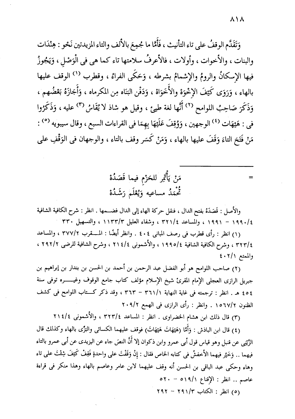 وتقدم الوقف على تاء التأنيث، فأما ما جمع بالألف والتاء المزيدتين نحو: هندات والبنات، والأخوات، وأولات، فالأعرف سلامتها تاء كما هي في الوصل، ويجوز فيها الإسكان والروم والإشمام بشرطه، وحكى الفراء، وقطرب الوقف عليها بالهاء، وروى كيف الإخوة والأخواه، ودفن البناه من المكرماه، وأجازه بعضهم، وذكر صاحب اللوامح أنها لغة طيئ، وقيل هو شاذ لا يقاس عليه، وذكروا في: هيهات الوجهين، ووقف عليها بهما في القراءات السبع، وقال سيبويه: من فتح التاء وقف عليها بالهاء، ومن كسر وقف بالتاء، والوجهان في الوقف على