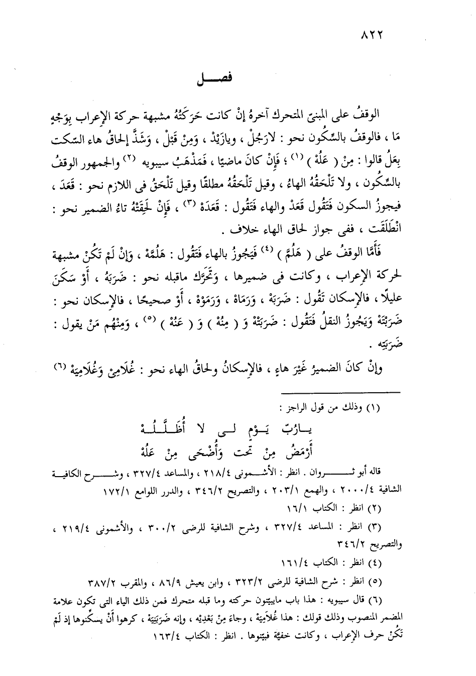 فأما الوقف على (هلم) فيجوز بالهاء فتقول: هلمه، وإن لم تكن مشبهة لحركة الإعراب، وكانت في ضميرها، وتحرك ما قبله نحو: ضربه، أو سكن عليلاً، فالإسكان تقول: ضربه، ورماه، ورموه، أو صحيحًا، فالإسكان نحو: ضربته ويجوز النقل فتقول: ضربته و (منه) و (عنه)، ومنهم من يقول: ضربته.