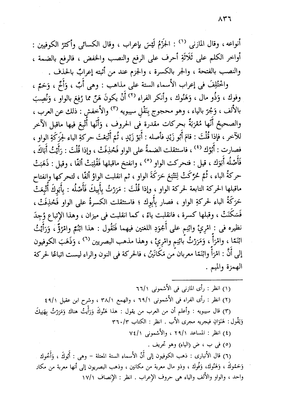 واختلف في إعراب الأسماء الستة على مذاهب: وهي أب، وأخ، وحم، وفوك، وذو مال، وهنوك، وأنكر الفراء أن يكون هن مما رفع بالواو، ونصب بالألف، وجر بالياء، وهو محجوج بنقل سيبويه والأخفش: ذلك عن العرب، والصحيح أنها معربة بحركات مقدرة في الحروف، وأنها أتبع فيها ما قبل الآخر للآخر، فإذا قلت: قام أبو زيد فأصله: أبو زيد، ثم أتبعت حركة الباء لحركة الواو، فصارت: أبوك، فاستثقلت الضمة على الواو فحذفت، وإذا قلت: رأيت أباك، فأصله أبوك، قيل: فتحركت الواو، وانفتح ما قبلها فقلبت ألفًا، وقيل: ذهبت حركة الباء، ثم حركت لتتبع حركة الواو، ثم انقلبت الواو ألفًا، لتحركها وانفتاح ما قبلها الحركة التابعة لحركة الواو، وإذا قلت: مررت بأبيك فأصله: بأبوك أتبعت حركة الباء لحركة الواو، فصار بأبوك؛ فاستثقلت الكسرة على الواو فحذفت، فسكنت، وقبلها كسرة، فانقلبت ياء، كما انقلبت في ميزان، وهذا الاتباع وجد نظيره في: امرئ وابنم على أجود اللغتين فيهما فتقول: هذا ابنم وامرؤ، ورأيت ابنما، وامرأ، ومررت بابنم وامرئ، وهذا مذهب البصريين، وذهب الكوفيون إلى أن: امرأ وابنما معربان من مكانين، فالحركة في النون والراء ليست اتباعًا لحركة الهمزة والميم.