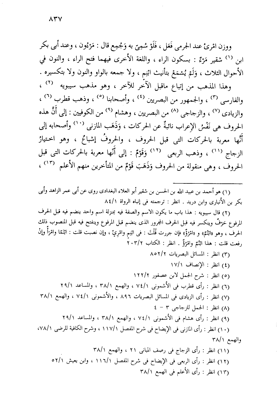 ووزن امرئ عند الجرمي فعل، فلو سمى به وجمع قال: مرءون، وعند أبي بكر ابن شقير مرء: بسكون الراء، واللغة الأخرى فيهما فتح الراء، والنون في الأحوال الثلاث، ولم يسمع بتأنيث ابنم، ولا جمعه بالواو والنون ولا بتكسيره.