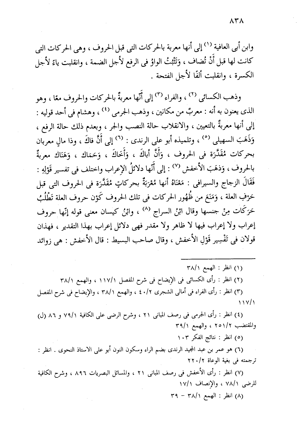 وذهب الكسائي، والفراء إلى أنها معربة بالحركات والحروف معًا، وهو الذي يعنون به أنه: معرب من مكانين، وذهب الجرمي، وهشام في أحد قوليه: إلى أنها معربة بالتعيين، والانقلاب حالة النصب والجر، وبعدم ذلك حالة الرفع، وذهب السهيلي، وتلميذه أبو علي الرندي: إلى أن فاك، وذا مال معربان بحركات مقدرة في الحروف، وأن أباك، وأخاك، وحماك، وهناك معربة بالحروف، وذهب الأخفش: إلى أنها دلائل الإعراب واختلف في تفسير قوله: فقال الزجاج والسيرافي: معناه أنها معربة بحركات مقدرة في الحروف التي قبل حرف العلة، ومنع من ظهور الحركات في تلك الحروف كون حروف العلة تطلب حركات من جنسها وقال ابن السراج، وابن كيسان معنى قوله إنها حروف إعراب ولا إعراب فيها لا ظاهر ولا مقدر فهي دلائل إعراب بهذا التقدير، فهذان قولان في تفسير قول الأخفش، وقال صاحب البسيط: قال الأخفش: هي زوائد