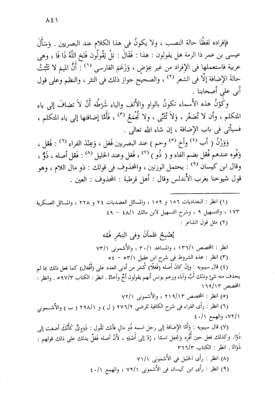 فإفراده لفظًا حالة النصب، ولا يكون في هذا الكلام عند البصريين. وسأل عيسى بن عمر ذا الرمة هل يقولون: هذا: فقال: بل يقولون فتح الله ذا فا، وهي عربية فاستعملها في الإفراد من غير عوض، وزعم الفارسي: أن الميم لا تثبت حالة الإضافة إلا في الشعر، والصحيح جواز ذلك في النثر، والنظم وعلى قول أبي على أصحابنا.