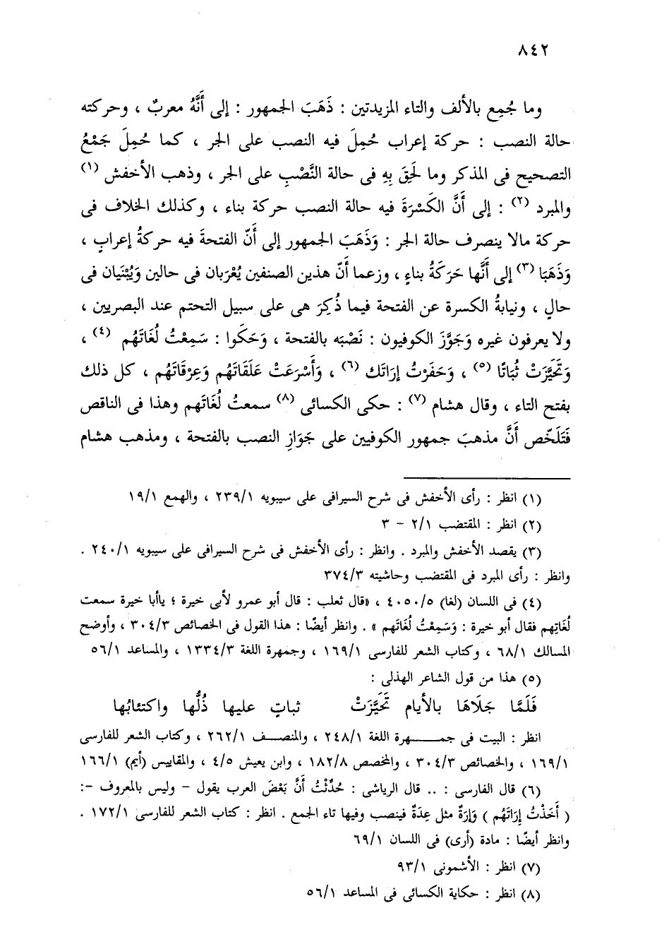 وما جمع بالألف والتاء المزيدتين: ذهب الجمهور: إلى أنه معرب، وحركته حالة النصب: حركة إعراب حمل فيه النصب على الجر، كما حمل جمع التصحيح في المذكر وما لحق به في حالة النصب على الجر، وذهب الأخفش والمبرد: إلى أن الكسرة فيه حالة النصب حركة بناء، وكذلك الخلاف في حركة ما لا ينصرف حالة الجر: وذهب الجمهور إلى أن الفتحة يعربان في حالين ويبنيان في حال، ونيابة الكسرة عن الفتحة فيما ذكر هي على سبيل التحتم عند البصريين، ولا يعرفون غيره وجوز الكوفيون: نصبه بالفتحة، وحكوا: سمعت لغاتهم، وتحيرت ثباتًا، وحفرت إراتك، وأسرعت علقاتهم وعرقاتهم، كل ذلك بفتح التاء، وقال هشام: حكى الكسائي سمعت لغاتهم وهذا في الناقص فتلخص أن مذهب جمهور الكوفيين على جواز النصب بالفتحة، ومذهب هشام