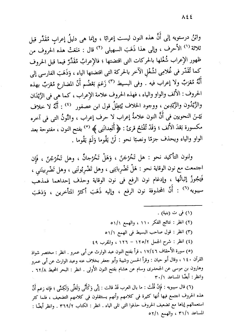 وابن درستويه إلى أن هذه النون ليست إعرابًا، وإنما هي دليل إعراب مقدر قبل ثلاثة الأحرف، وإلى هذا ذهب السهيلي قال: منعت هذه الحروف من ظهور الإعراب شغلها بالحركات التي اقتضتها؛ فالإعراب مقدر فيما قبل الحروف كما تقدر في غلامي لشغل الآخر بالحركة التي اقتضتها الياء، وذهب الفارسي إلى أنه معرب ولا إعراب فيه. وفي البسيط زعم بعضهم أن المضارع معرب بهذه الحروف: الألف والواو والياء، فهذه الحروف علامة الإعراب، كما هي في الزيدان والزيدون والزيدين، ووجود الخلاف يبطل قول ابن عصفور: أنه لا خلاف بين النحويين في أن النون علامة إعراب لا حرف إعراب، والنون التي في آخره مكسورة بعد الألف؛ وقد تفتح قرئ: [أتعدانني] بفتح النون، مفتوحة بعد الواو والياء ويحذف جزمًا ونصبًا نحو: لن يقوما ولم يقوما.