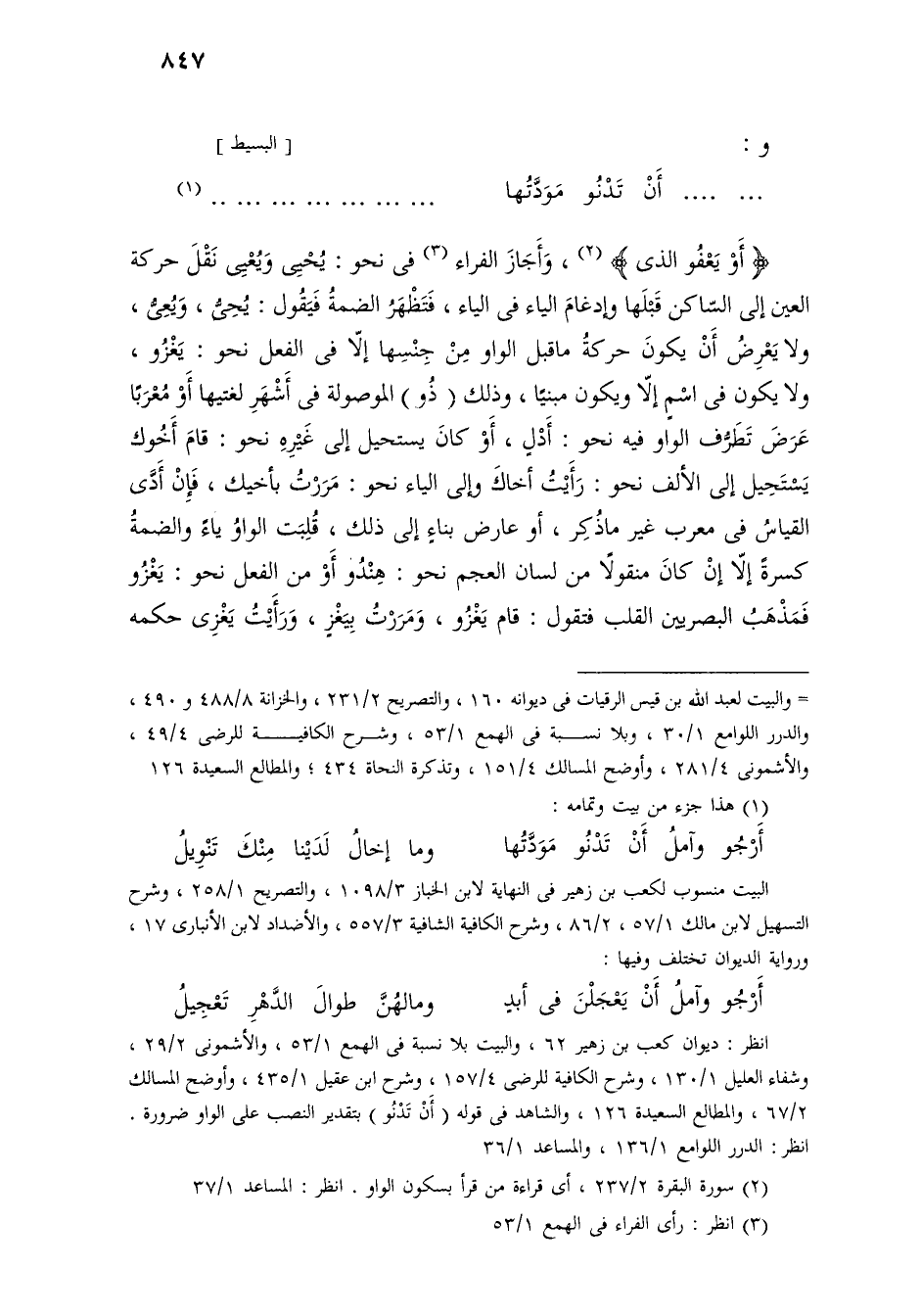 [أو يعفو الذي]، وأجاز الفراء في نحو: يحيى ويعيى نقل حركة العين إلى الساكن قبلها وإدغام الياء في الياء، فتظهر الضمة فيقول: يحيى، ويعى، ولا يعرض أن يكون حركة ما قبل الواو من جنسها إلا في الفعل نحو: يغزو، ولا يكون في اسم إلا ويكون مبنيًا، وذلك (ذو) الموصولة في أشهر لغتيها أو معربًا تعرض تطرف الواو فيه نحو: أدل، أو كان يستحيل إلى غيره نحو: قام أخوك يستحيل إلى الألف نحو: رأيت أخاك وإلى الياء نحو: مررت بأخيك، فإن أدى القياس في معرب غير ما ذكر، أو عارض بناء إلى ذلك، قلبت الواو ياء والضمة كسرة إلا إن كان منقولاً من لسان العجم نحو: هندو أو من الفعل نحو: يغزو فمذهب البصريين القلب فتقول: قام يغزو، ومررت بيغز، ورأيت يغزى حكمه