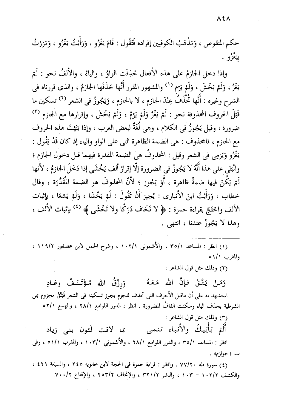 وإذا دخل الجازم على هذه الأفعال حذفت الواو، والياء، والألف نحو: لم يغز، ولم يخش، ولم يرم والمشهور المقرر أنها حذفها الجازم، والذي قررناه في الشرح وغيره: أنها تحذف عند الجازم، لا بالجازم، ويجوز في الشعر تسكين ما قبل الحروف المحذوفة نحو: لم يغز ولم يرم، ولم يخش، وإقرارها مع الجازم ضرورة، وقيل يجوز في الكلام، وهي لغة لبعض العرب، وإذا بنيت هذه الحروف مع الجازم، فالمحذوف: هي الضمة الظاهرة التي على الواو والياء إذ كان قد يقول: يغزو ويرمى في الشعر وقيل: المحذوف هي الضمة المقدرة فيهما قبل دخول الجازم؛ وانبنى على هذا أنه لا يجوز في الضرورة إلا إقرار ألف يخشى إذا دخل الجازم، لأنها لم يكن فيها ضمة ظاهرة، أو يجوز؛ لأن المحذوف هو الضمة المقدرة، وقال خطاب، ورأيت ابن الأنباري: يجيز أن تقول: لم يخشا، ولم يسعا، بإثبات الألف واحتج بقراءة حمزة: [لا تخاف دركا ولا تخشى] بإثبات الألف، وهذا لا يجوز عندنا، انتهى.